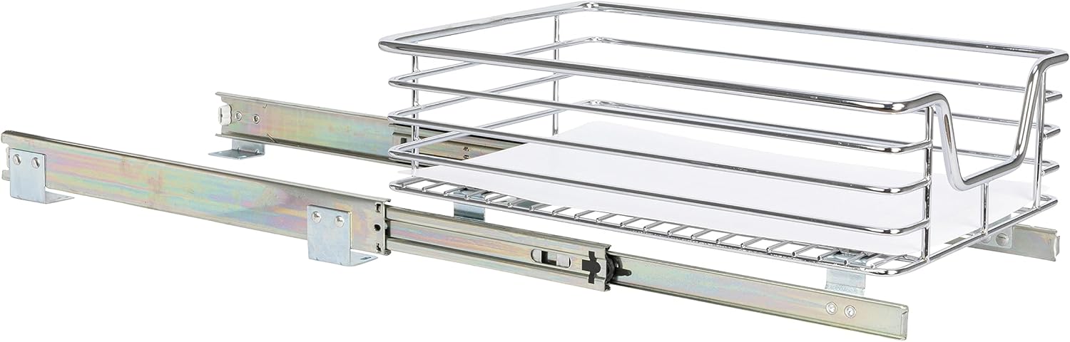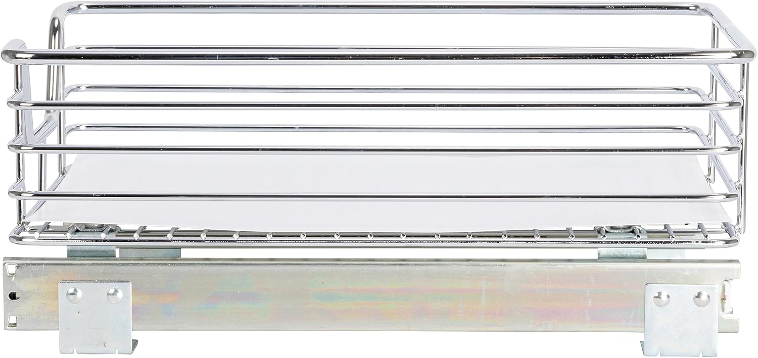 Disorganized and inaccessible cabinets and pantries are things of the past thanks to this sliding cabinet organizer by Design Trend. Measuring just 11.5 inches wide and 17.75 inches deep, this sliding cabinet organizer reduces unusable and wasted storage space in your narrowest of kitchen cabinets or linen closets. Drawer slides extend up to twice their size, so even items tucked away in the back corners of your cabinets are easily and instantly accessible. For added convenience and protection, the device comes with a removable and washable PE liner to keep items in place at all times. This unit is crafted from heavy duty, commercial-grade chrome-plated steel wire for maximum stability, durability, and strength. The basket slides effortlessly on mounted steel ball bearing tracks (included) for consistent, smooth sliding and easy access time and time again. The sliding cabinet organizer is perfect for towels and toiletries in your linen closet, accessories and loose items in your bedroom closets, or cleaning supplies and chemicals in your under sink storage. It is even strong enough to support your pots and pans, small appliances, or racks of heavy canned goods in your kitchen’s pantry. The universal organizer is designed for any cabinet, closet or pantry space measuring at least 12 inches wide by 18 inches deep. The glides and basket come fully assembled and ready to be installed. The installation process is simple and all mounting hardware for this sliding cabinet organizer is included.