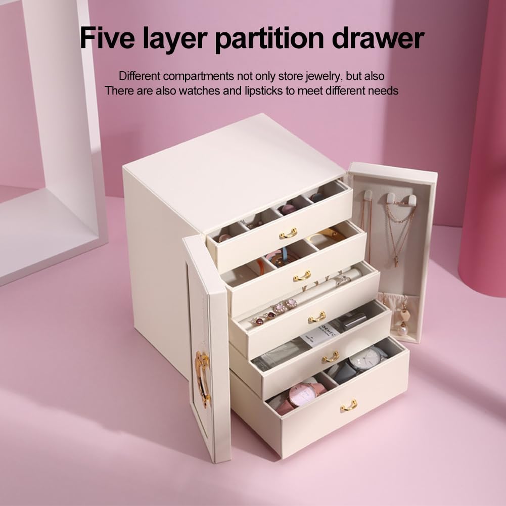【5 Tiers Jewelry & Watch Box】This 5-tier jewelry box boasts multiple layers with different compartments and layouts to keep all your jewelry, like stud earrings and rings, sorted and organized; the deep bottom drawer fits 3 watches and a pair of sunglasses