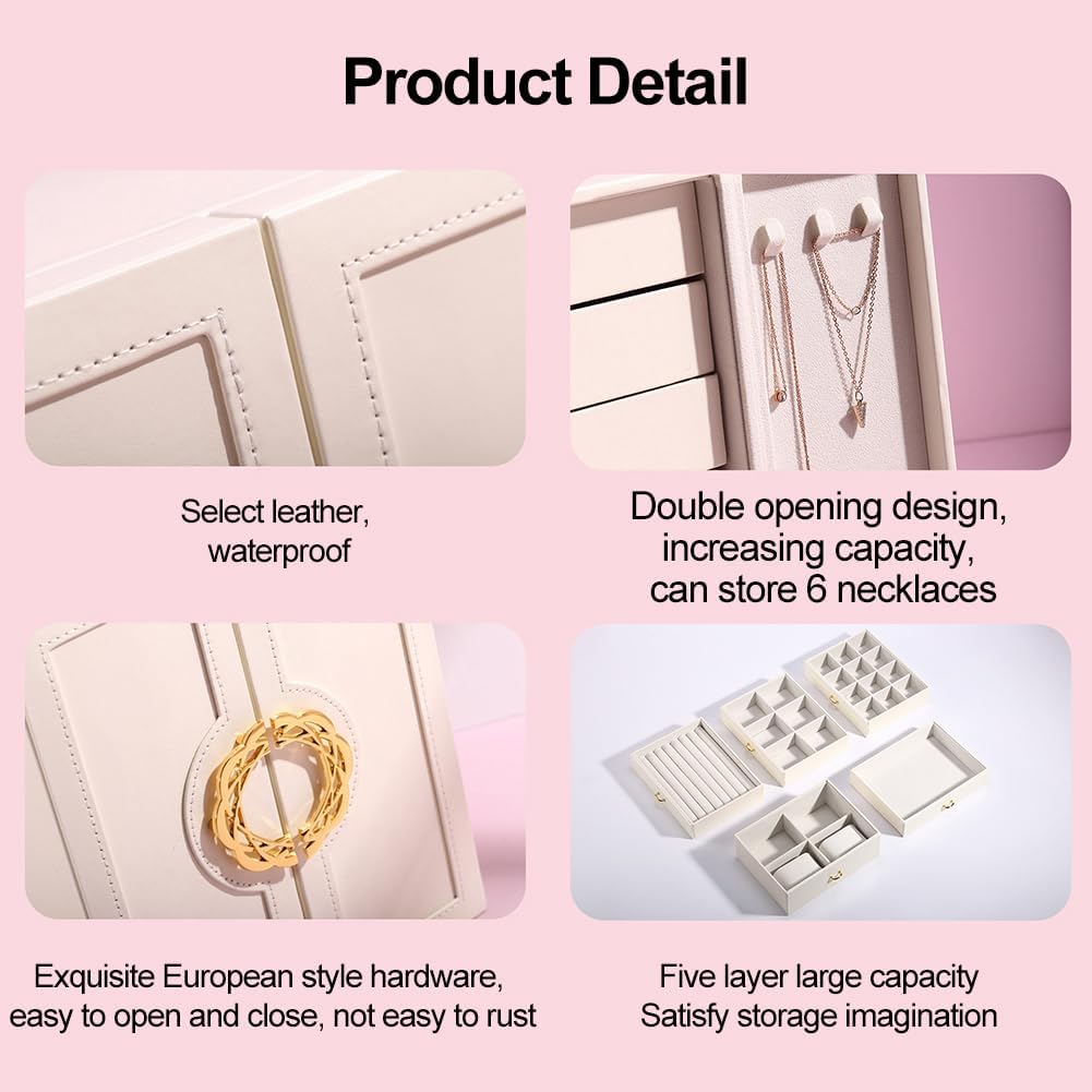 【All-in-One Jewelry Organizer】This huge jewelry box comes with 5 layers different layout organize room and 2 side compartments which include 6 hooks for necklace and 2 pockets that can help to keep your necklaces from getting tangled.This jewelry organizer could hold almost all your different jewelry and accessories in your daily life.