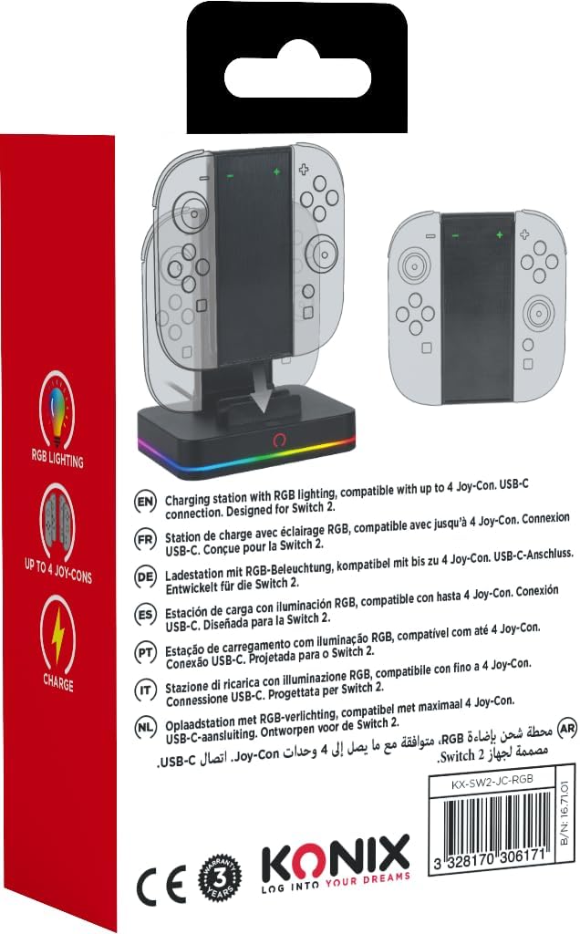 Be the first to review “Konix Ladestation für 2 Paare Joy-Con Controller Nintendo Switch 2 – LED-Ladeanzeige – 10 RGB-Beleuchtungsmodi – Schwarz” Cancel reply