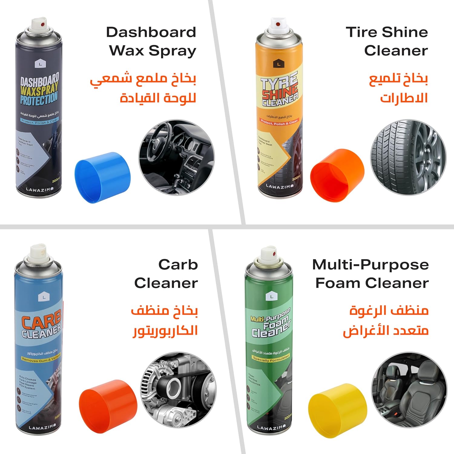 Be the first to review “Lawazim Multi-Purpose Automotive Cleaning Spray Set – 4 Sprays with 4-Piece Car Cleaning Wipers 30x30cm – Complete Car Care Kit All-Purpose Foam Cleaner, Tire Shine, Wax Spray, and Carburetor Cleaner” Cancel reply