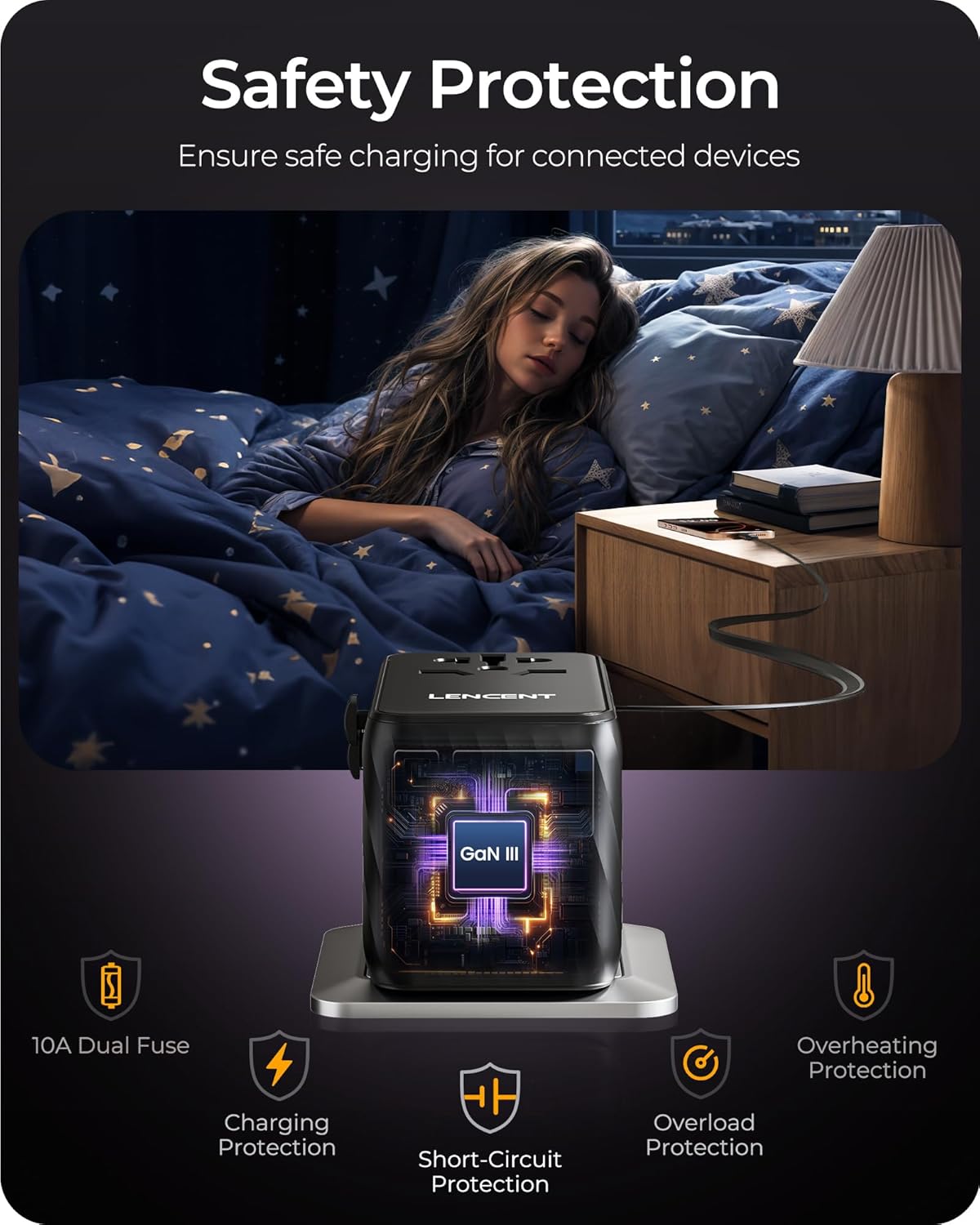 Warm Tips: The travel universal socket adapter has dual 10A fuses and a smart GaN III chip to protect your devices. However, it does NOT convert voltage from 110V to 220V or vice versa. A separate converter may be required for high-power devices like hair dryers or styling irons. Please check the device and destination voltage compatibility before use