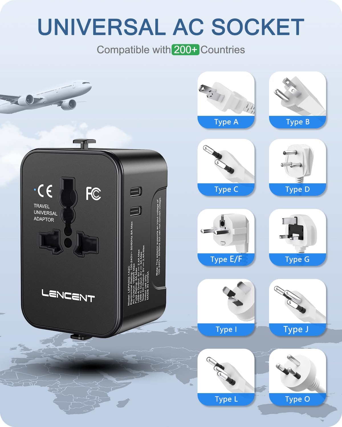 LENCENT International Travel Adapter, Universal Travel Adapter with 1 USB-A + 2 Type C, All in One Power Adapter for Phone,Laptops, Worldwide Plug Adapter for USA UK EU AUS, Black