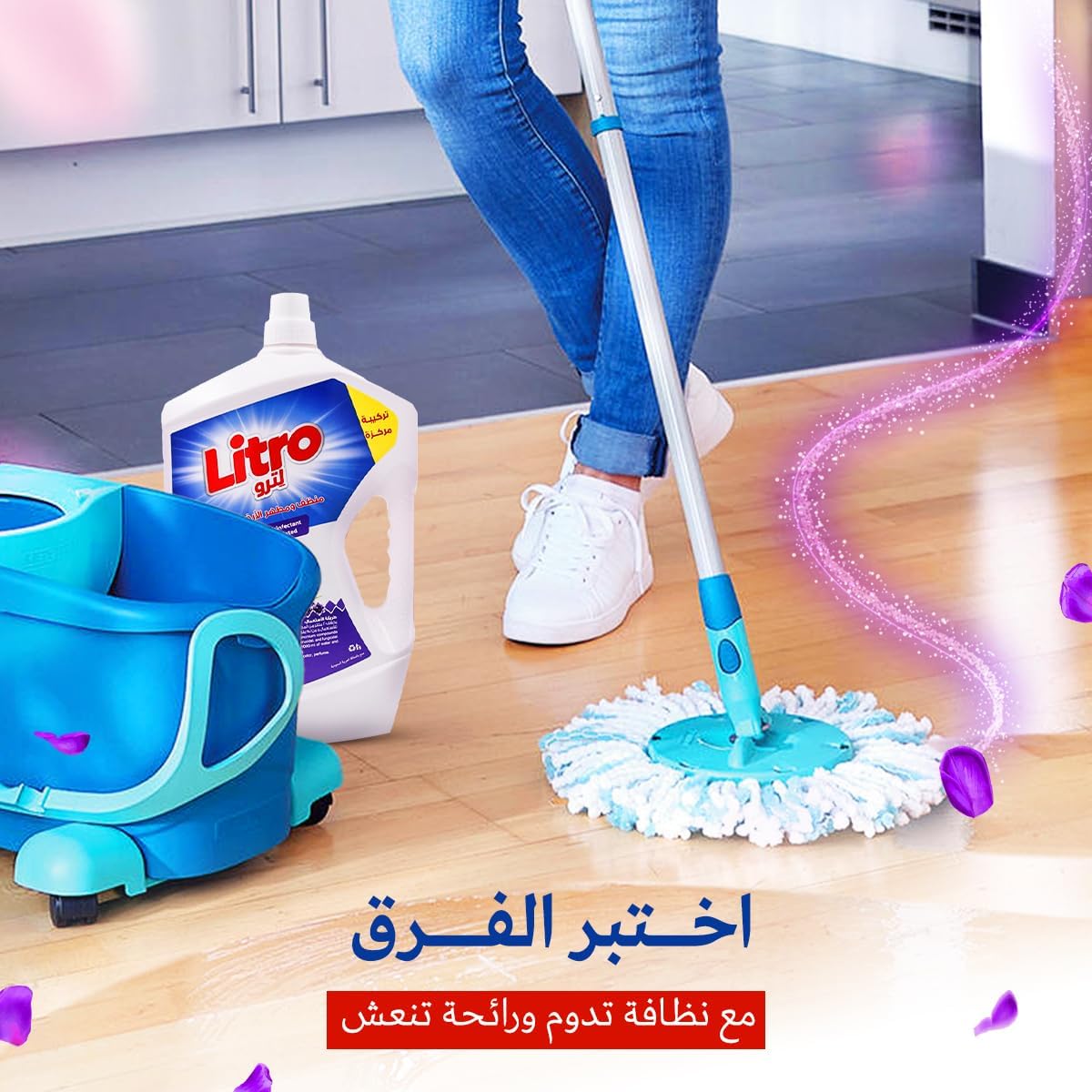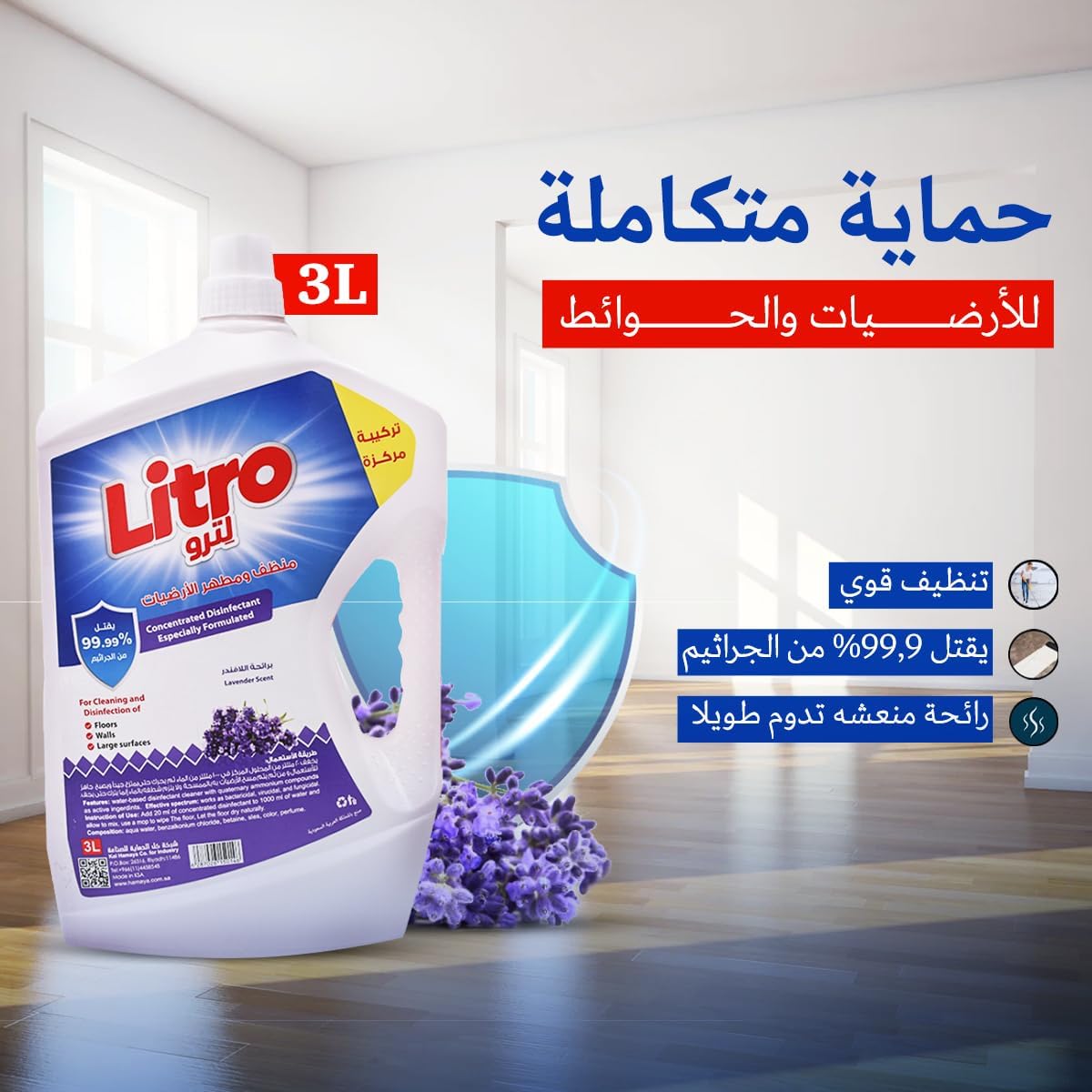 LITRO Floor Cleaner Disinfectant 3L with refreshing lavender scent, powerful formula for deep cleaning and total disinfection, leaving long-lasting shine and soothing lavender freshness in your home