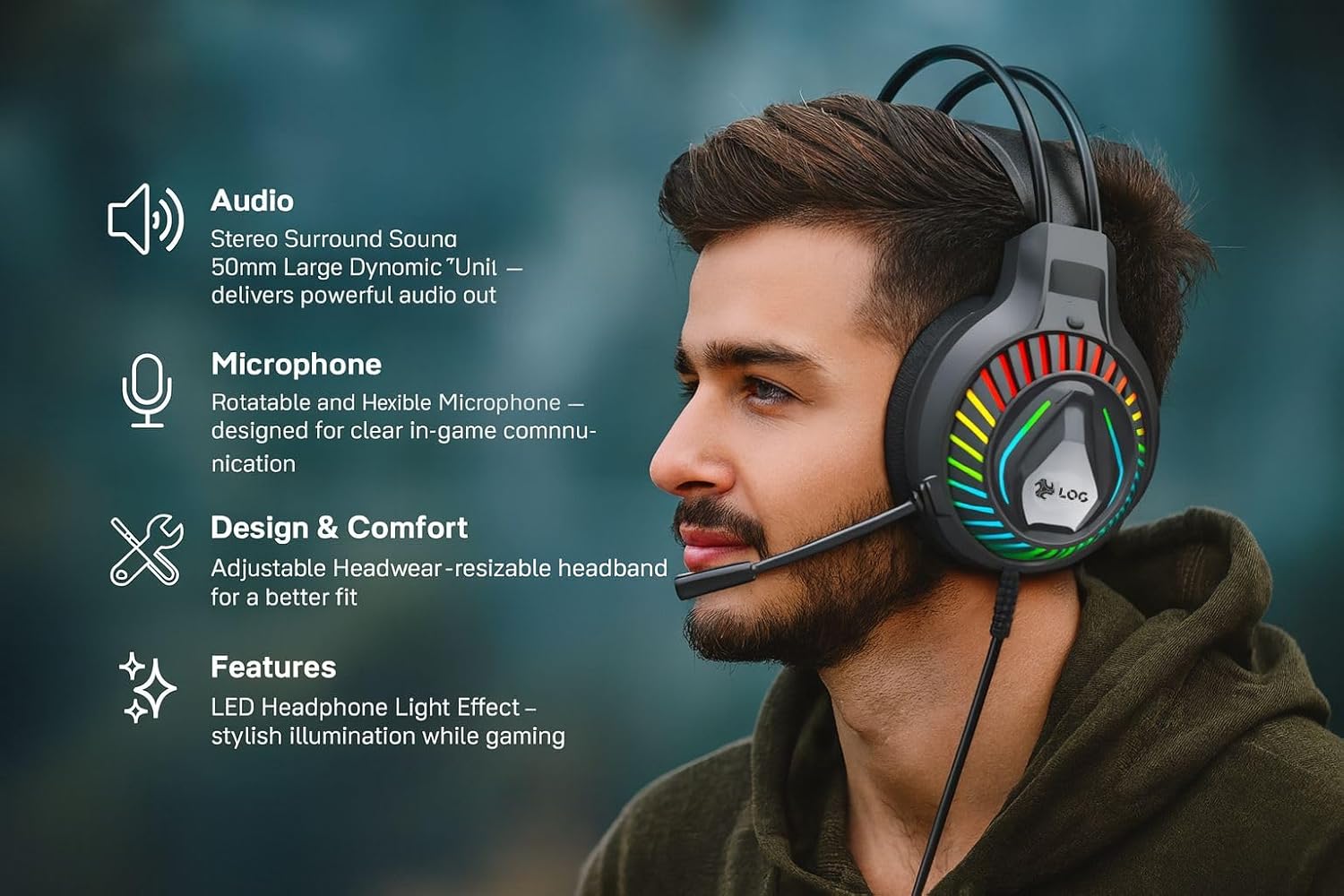 Features LED Headphone Light Effect – stylish illumination while gaming
