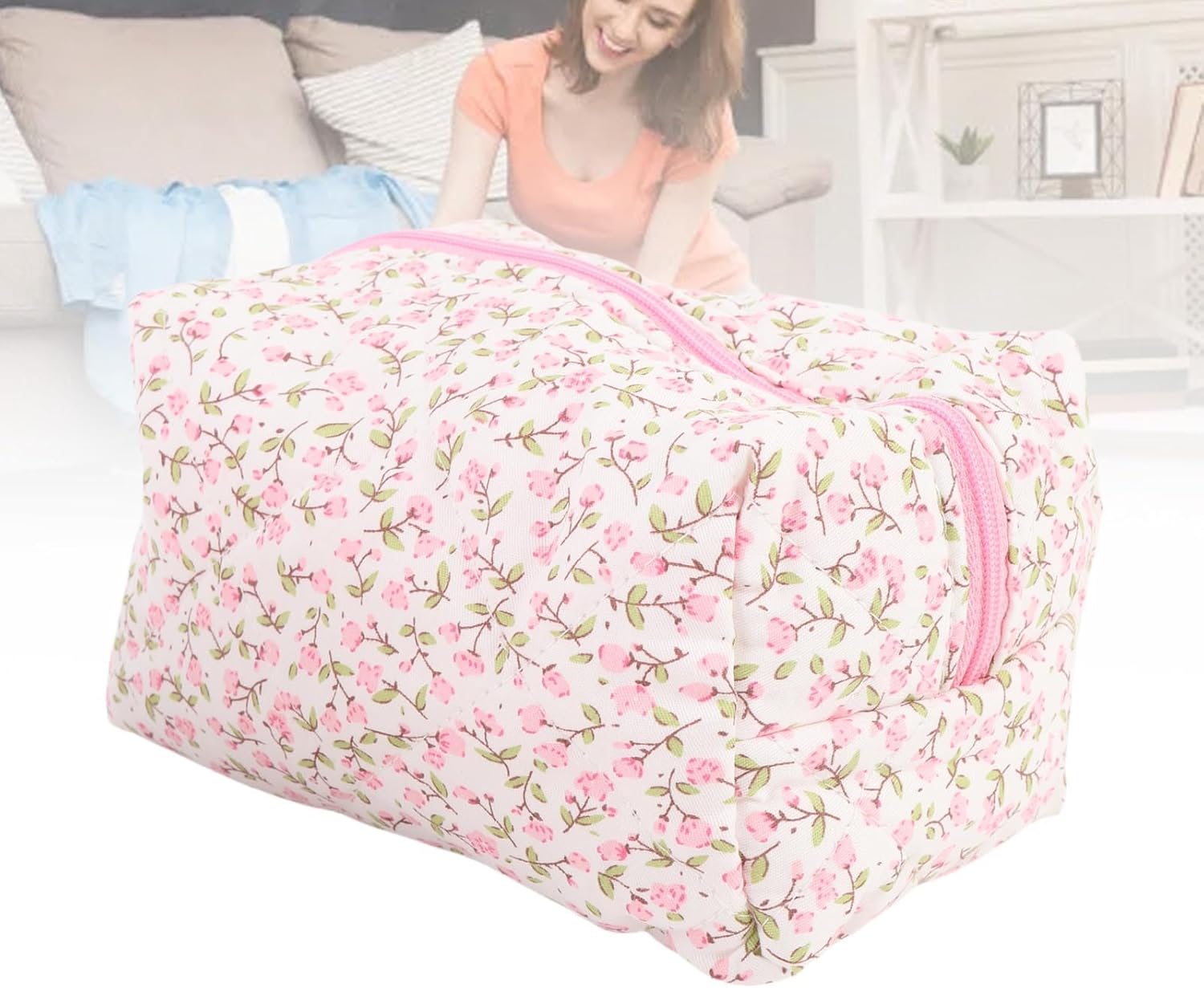 Luqeeg Quilted Makeup Bag with Zip, Floral Cosmetic Pouch, Soft Comfortable Travel Toiletry Organizer Makeup Brushes Storage for Storing Cosmetics Skin Care Products People Items (Pink)