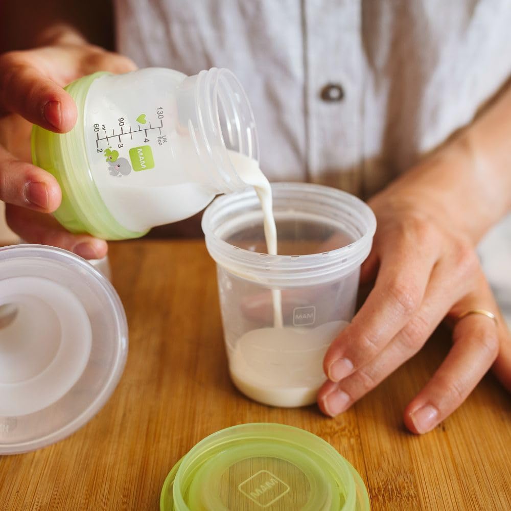 Flexible accessories – The leak-proof MAM storage cups are ideal for storing breast milk and baby food in the fridge and freezer.