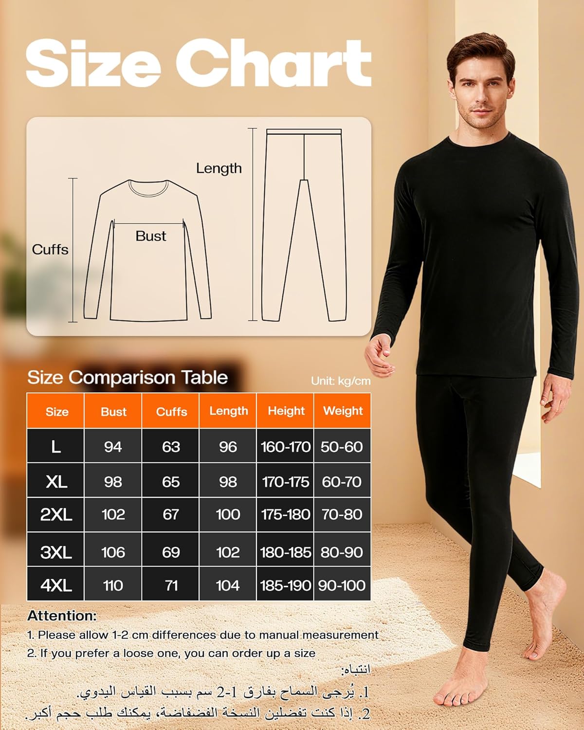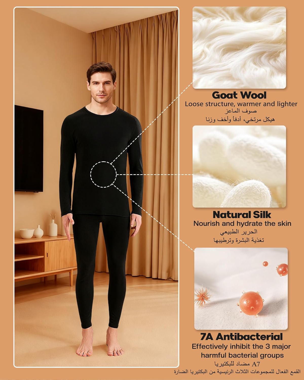 Men’s Thermal Underwear Set, Natural Silk and Fleece Lined Base Layer, Skin Friendly, Long Johns Top & Bottom Set, Suitable for Daily,Skiing,Hiking,Outdoor Sports