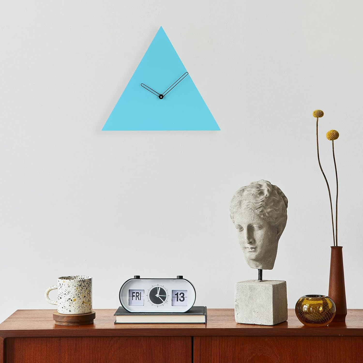 Transform your living space with this striking triangular wall clock in a soothing ocean blue shade. The minimalist design features sleek black hands against a clean, geometric face, creating a perfect blend of form and function. This contemporary timepiece serves as both a practical clock and a distinctive piece of wall art that adds a modern touch to any room. The bold triangular shape breaks away from traditional circular clocks, making it an eye-catching focal point in your home or office. Its simple yet sophisticated aesthetic complements various interior styles, from modern to Scandinavian. The clock’s minimalist face ensures excellent readability while maintaining its artistic appeal. Perfect for mounting in living rooms, bedrooms, offices, or any space that could use a dash of contemporary style. The clean lines and serene blue colour create a sense of calm while keeping precise time. This unique wall clock isn’t just a timekeeping device – it’s a statement piece that elevates your interior design with its geometric charm.
