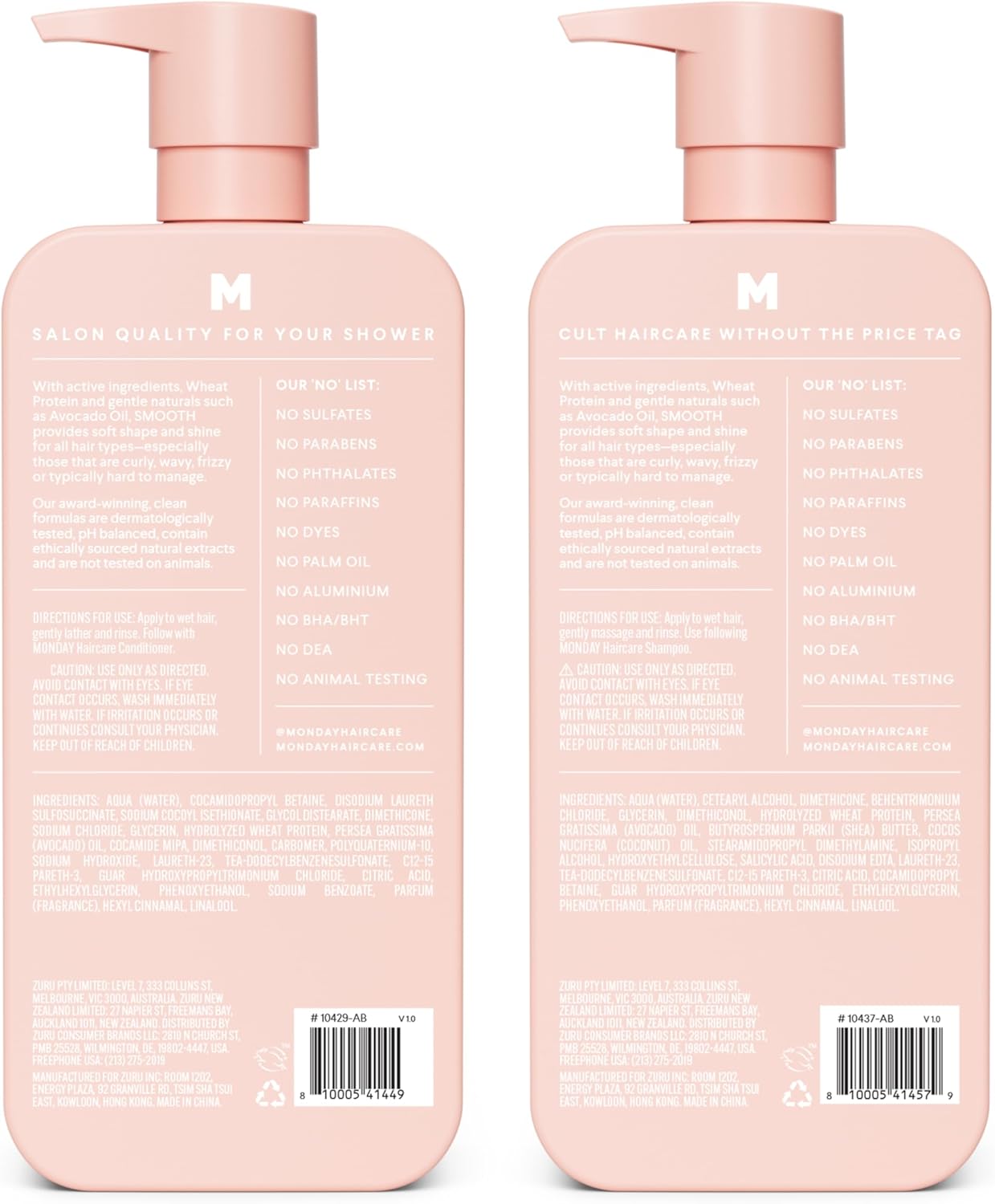 MONDAY Haircare SMOOTH Shampoo and Conditioner set for women is good for frizzy and unmanageable hair and curly and wavy hair types. It’s also safe for color-treated hair. This defrizzing Shampoo and Conditioner helps to soften and smooth hair with Coconut Oil, Shea Butter and Vitamin E—ingredients that help support hair health and maintain normal hair growth and thickness. MONDAY Haircare’s salon-quality Shampoo and Conditioner formulas are dermatologically tested, PH-balanced, and free from SLS, parabens and phthalates. They instead contain premium natural ingredients such as shea butter, coconut oil, rice protein, vitamin E and provitamin B5 to nourish and restore. Our range of Shampoo and Conditioner has close to a dozen major beauty awards, including a Cosmopolitan 2021 Holy Grail Beauty Award, Glamour 2021 Beauty Award, Cosmopolitan 2021 Beauty Award, and an InStyle 2022 Best Beauty Buy Award. MONDAY has also been featured by Vogue, ELLE, Harper’s BAZAAR, Allure, Refinery29 and Byrdie. All of MONDAY’s products are approved as cruelty-free under the Leaping Bunny programme. We’re also proud to be recognised by PETA as a brand that does not test on animals. Our pink bottles are also made from 100% recyclable plastic to help minimise carbon footprint and reduce landfill.