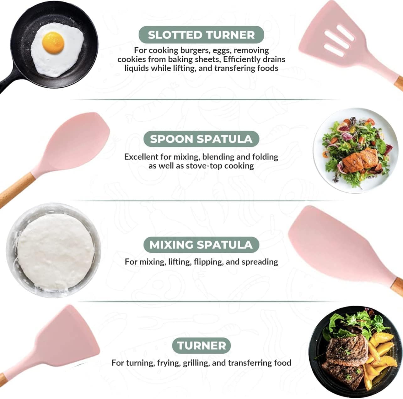 【Designed for Your Utmost Convenience】 Silicone cooking utensils can help you solve the problem, this kitchen utensil is made of high-quality silica gel material, strong enough to stir hot food without scratching the pot.