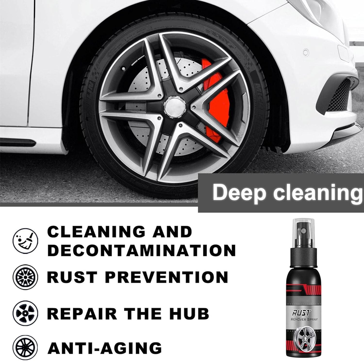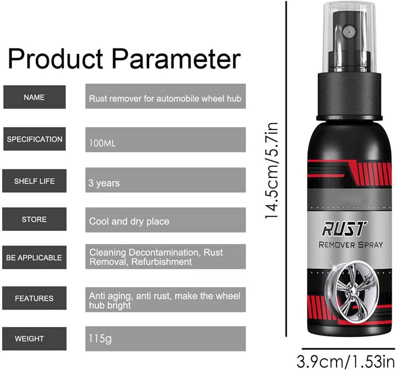 Car Rust Remover quickly cleans stains from metal hardware, nuts, bolts, and other iron fittings. Remove rust from metal surfaces without damaging the paint. Rust Remover for Cars can remove fog, oxidation, rust and fine particles from metal surfaces, restore gloss and prevent rust. Suitable for metal surfaces such as chrome, magnesium, aluminum, stainless steel clamps, etc.