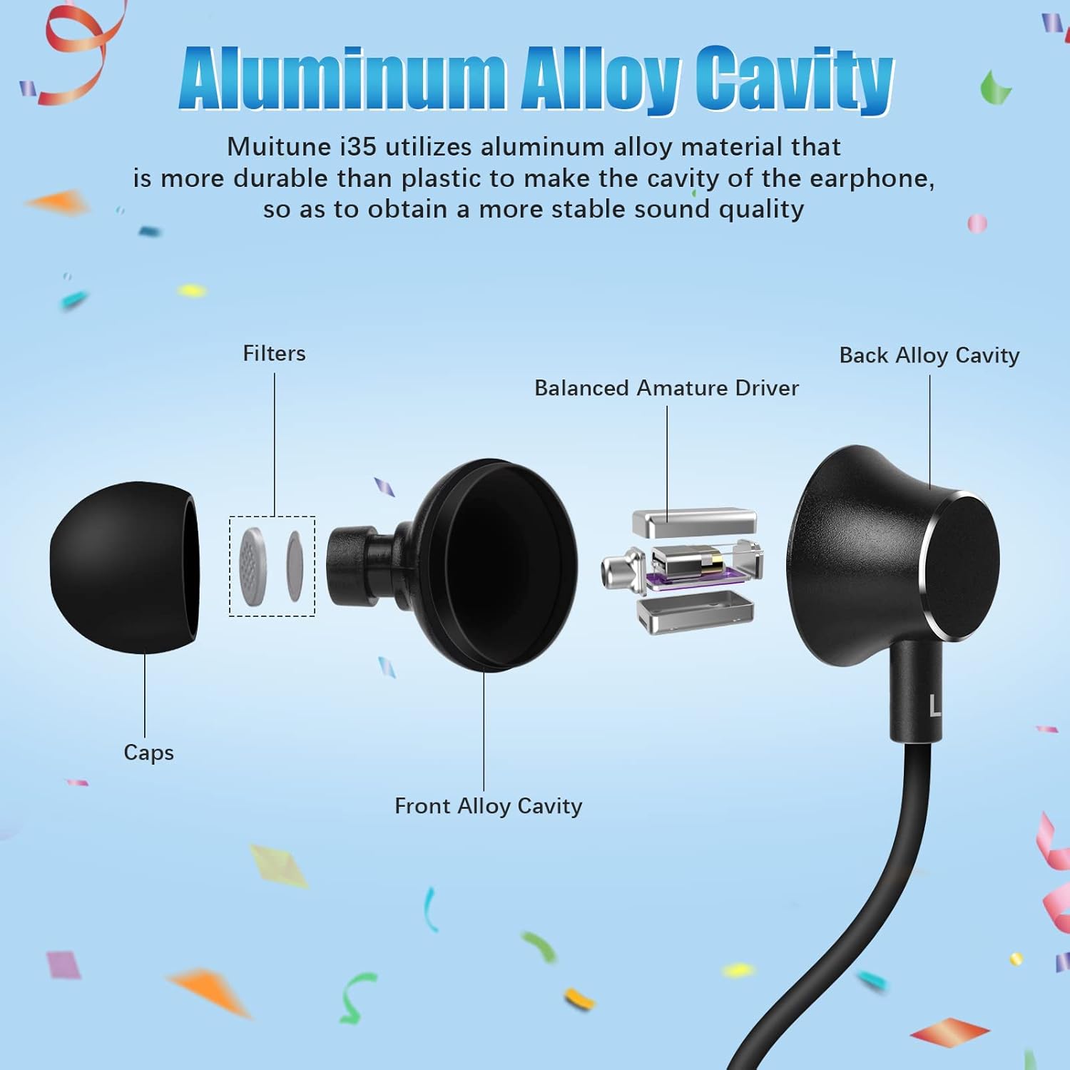 🎵 PLEASANT VIVID SOUND: These earbuds feature a hybrid design with a custom-tuned balanced armature driver for each earbud and a 10mm neodymium diaphragm. This combination delivers powerful and vivid bass along with stereo sound. The aluminum alloy cavity effectively prevents interference with external signals, ensuring a stable audio experience.