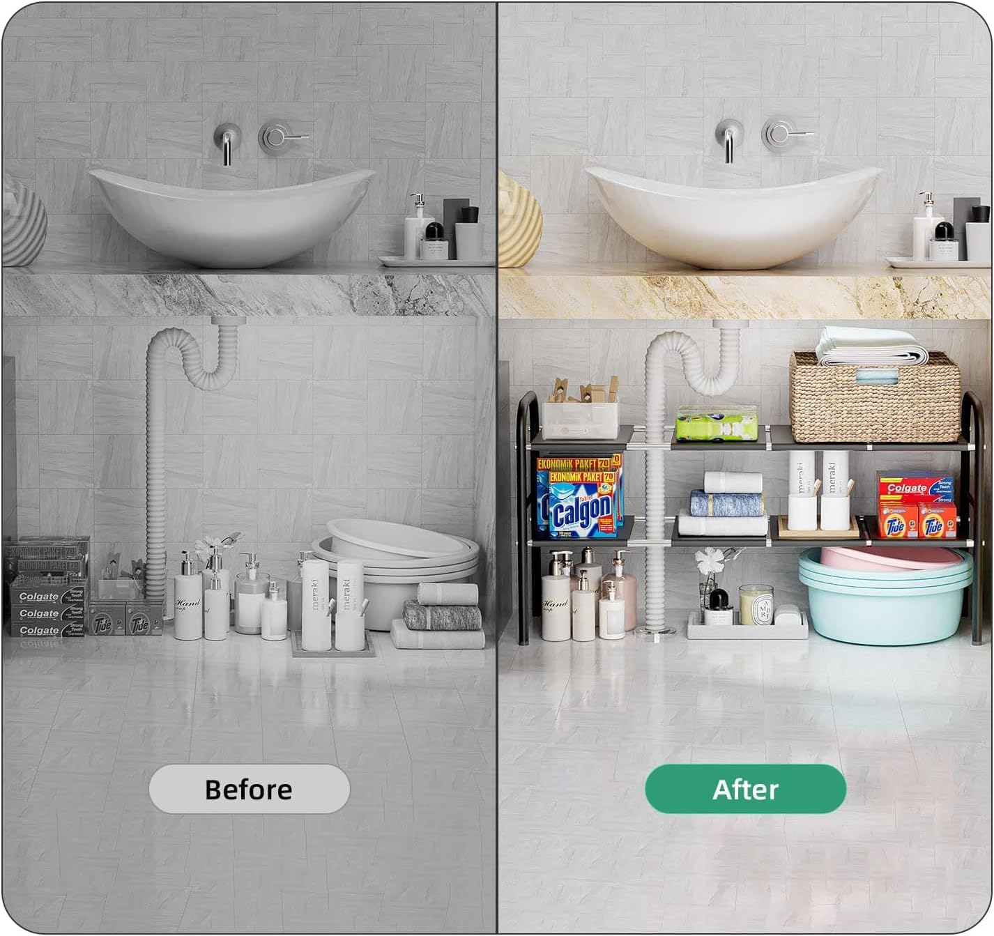 Under Sink Storage Organizer is the perfect solution for keeping your sink and cabinet area organized and clutter-free.