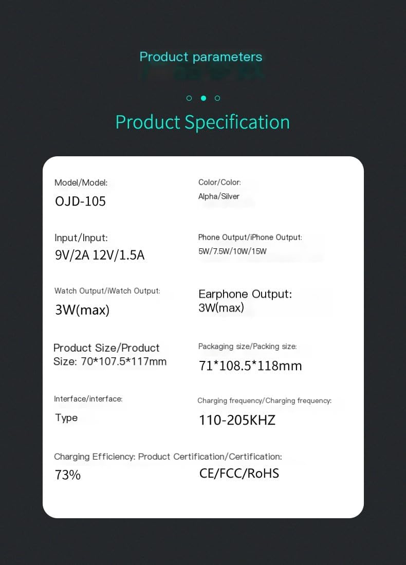 Product output: mobile phone 5W/7.5W/10W/15W; headset and watch 3W (Max)