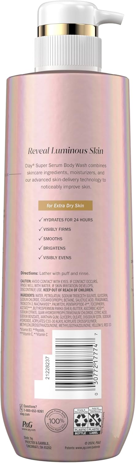 Rejuvenate extra dry skin with Olay Super Serum Body Wash. This body wash is designed to take coarse, rough skin and transform it into the skin you want. See and feel the difference of 5+ ingredients in the new OLAY Super Serum Body Wash as they work to brighten, even, firm skin for an ultra-luminous look. Hydrate your skin for 24 hours with our new body wash and experience how skin care ingredients, moisturizers, and our advanced skin-delivery technology can noticeably improve your skin. This body wash for women is formulated with Olay Super Serum technology: Niacinamide, BHA, Collagen Peptide, Vitamin E, and Shea Butter. It’s dermatologist-tested and free of phthalates and silicones. Directions: Simply lather the Super Serum Body Wash with a puff and rinse.