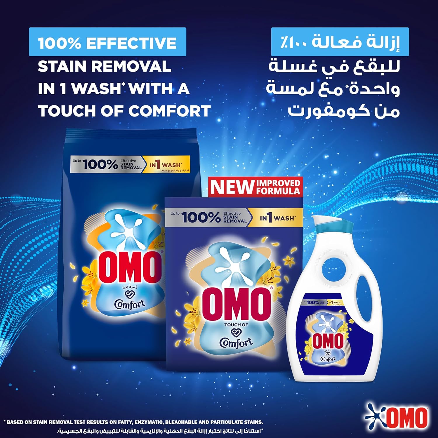 OMO Active Laundry Powder Detergent with a touch of Comfort now in a fresh new look, maintains its toughness against stains. OMO Active Powder with a touch of Comfort provides up to 100% stain removal in just one wash*, formulated specifically to tackle the toughest stains. Its advanced formula targets the root of the stain, dissolving rapidly and penetrating fabric deeply to lift stains completely away. Enjoy a fresh and lasting fragrance with OMO Active Powder detergent, leaving your clothes smelling clean for longer. For optimal results, use 1+½ cups for lightly soiled clothes and 2 cups for heavily soiled garments. For handwash use 1/2 cup for 10 litres of water. For anti-bacterial action wash clothes at least 45 minutes. For best laundry results use OMO & Comfort Perfumes Deluxe. Always check the articles care label and follow the washing instructions. Explore the full range of OMO Powder Laundry Detergents, including OMO Touch of Comfort for a fresh fragrance, OMO Sensitive for delicate skin, and OMO Black for Abayas and black fabrics. With OMO Active Laundry Detergent Powder, you get a powerful clean, lasting freshness, and a variety of options to suit your laundry needs. *Based on stain removal test results on fatty, enzymatic, bleachable and particulate stains
