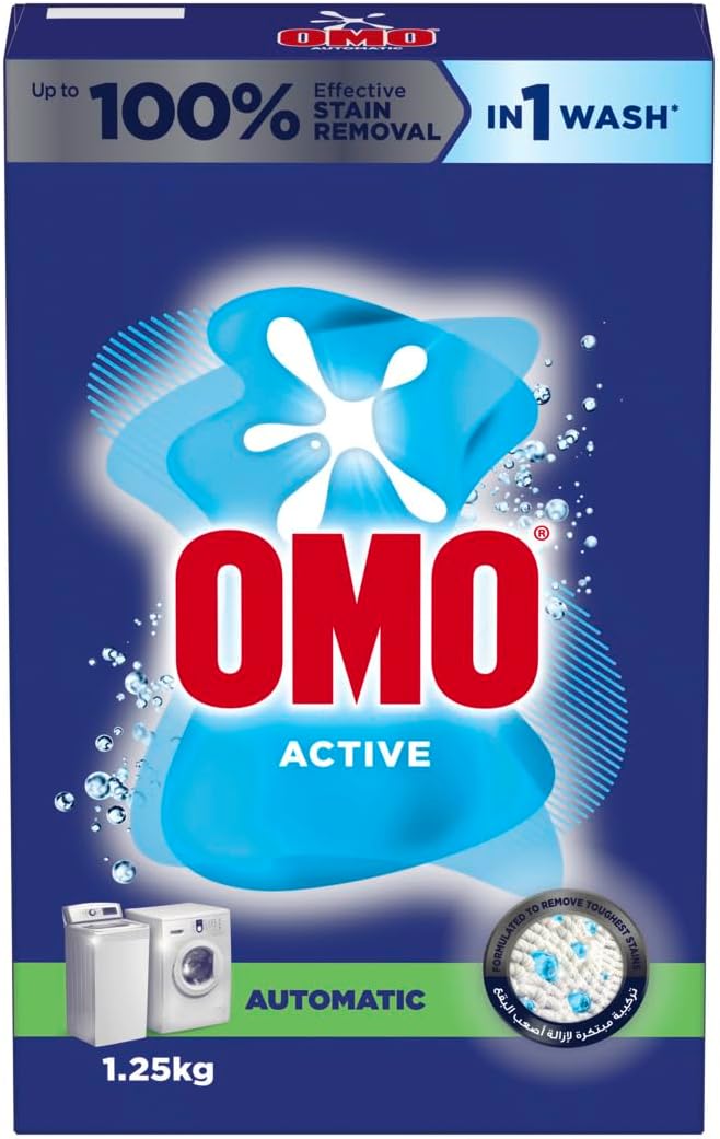 OMO Active Laundry Detergent Powder, now in a fresh new look. OMO Active Powder provides up to 100% stain removal in just one wash*, formulated specifically to tackle the toughest stains. Its advanced new formula targets the root of the stain, dissolving rapidly and penetrating fabric deeply to lift stains completely away. Enjoy a fresh and lasting fragrance with OMO Active Powder detergent, leaving your clothes smelling clean for longer For anti-bacterial action wash clothes at least 45 minutes. For best laundry results use OMO & Comfort. Always check the articles care label and follow the washing instructions. Explore the full range of OMO Powder Laundry Detergents, including OMO Touch of Comfort for a fresh fragrance, OMO Sensitive for delicate skin, and OMO Black for Abayas and black fabrics. With OMO Active Laundry Detergent Powder, you get a powerful clean, lasting freshness, and a variety of options to suit your laundry needs. Safety warning; Do not swallow. Rinse and dry hands thoroughly after use, Keep out of reach of children. Avoid contact with eyes. In case of contact with eyes, rinse immediately with water. People with sensitive or damaged skin should avoid prolonged contact with the wash solution, if the contact occurred please contact a doctor immediately. The use of gloves is recommended to prevent any unwanted problems. *Based on stain removal test results on fatty, enzymatic, bleachable and particulate stain