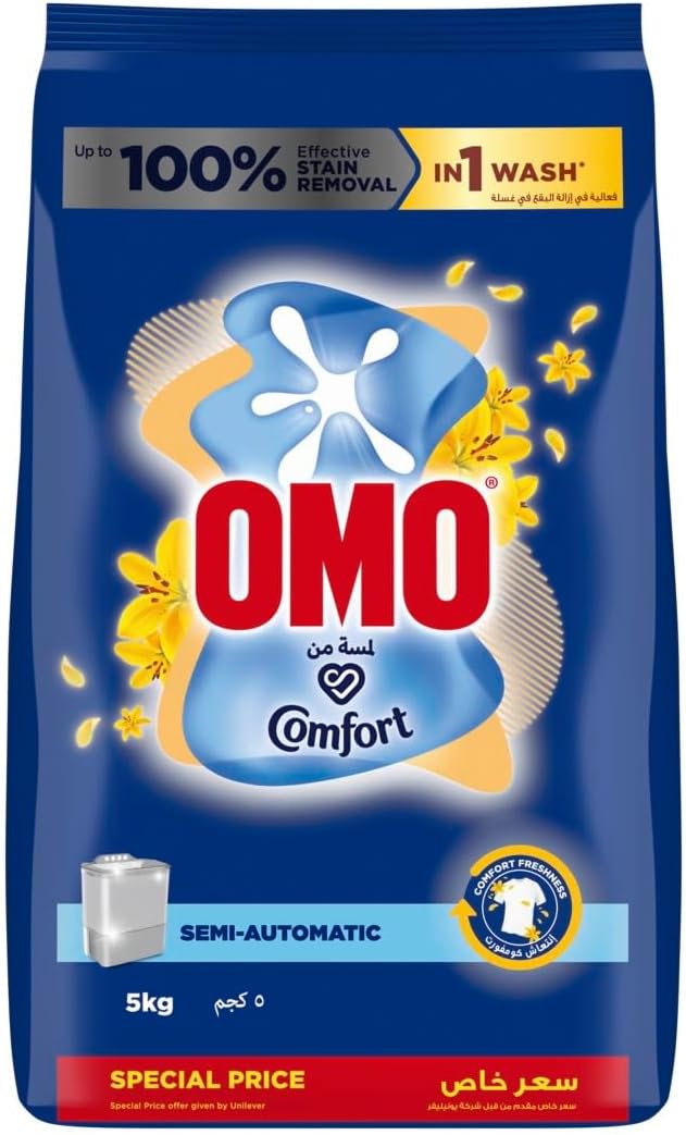 OMO Active Laundry Detergent Powder with a touch of Comfort now in a fresh new look, maintains its toughness against stains. OMO Active Powder with a touch of Comfort provides up to 100% stain removal in just one wash*, formulated specifically to tackle the toughest stains. Its advanced formula targets the root of the stain, dissolving rapidly and penetrating fabric deeply to lift stains completely away. Enjoy a fresh and lasting fragrance with OMO Active Powder detergent, leaving your clothes smelling clean for longer. For optimal results, use 1+½ cups for lightly soiled clothes and 2 cups for heavily soiled garments. For handwash use 1/2 cup for 10 litres of water. For anti-bacterial action wash clothes at least 45 minutes. For best laundry results use OMO & Comfort Perfumes Deluxe. Always check the articles care label and follow the washing instructions. Explore the full range of OMO Powder Laundry Detergents, including OMO Touch of Comfort for a fresh fragrance, OMO Sensitive for delicate skin, and OMO Black for Abayas and black fabrics. With OMO Active Laundry Detergent Powder, you get a powerful clean, lasting freshness, and a variety of options to suit your laundry needs. *Based on stain removal test results on fatty, enzymatic, bleachable and particulate stains