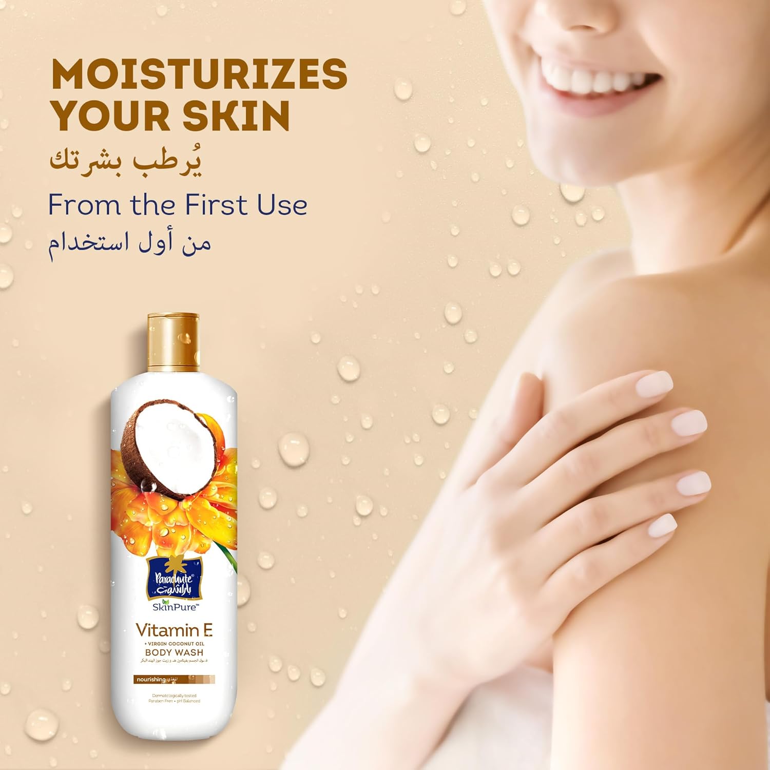 PARACHUTE SKIN PURE BODY WASH VITAMIN E | 100% Virgin Coconut Oil | Glowing Body Wash | Soap Free, Pabaen Free, restores pH Balance | Dermatologically Tested | 400ml