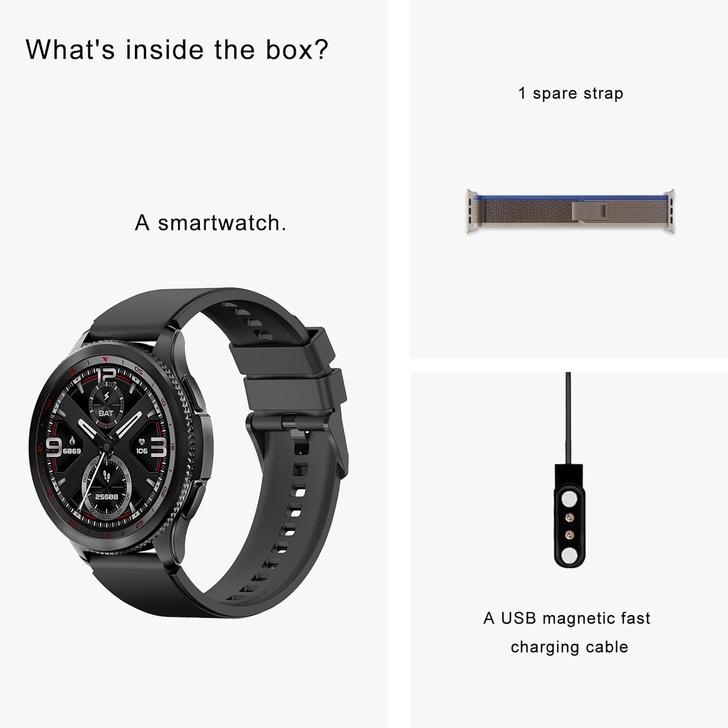 3ATM Waterproof & Premium Design: This smartwatch features a 3ATM waterproof rating, making it resistant to water splashes, rain, and swimming. Its sleek design combines a zinc alloy case, textured plastic shell, and a comfortable silicone strap, paired with a vibrant 1.43-inch AMOLED display (466*466 resolution) for a stylish and durable wearable experience.