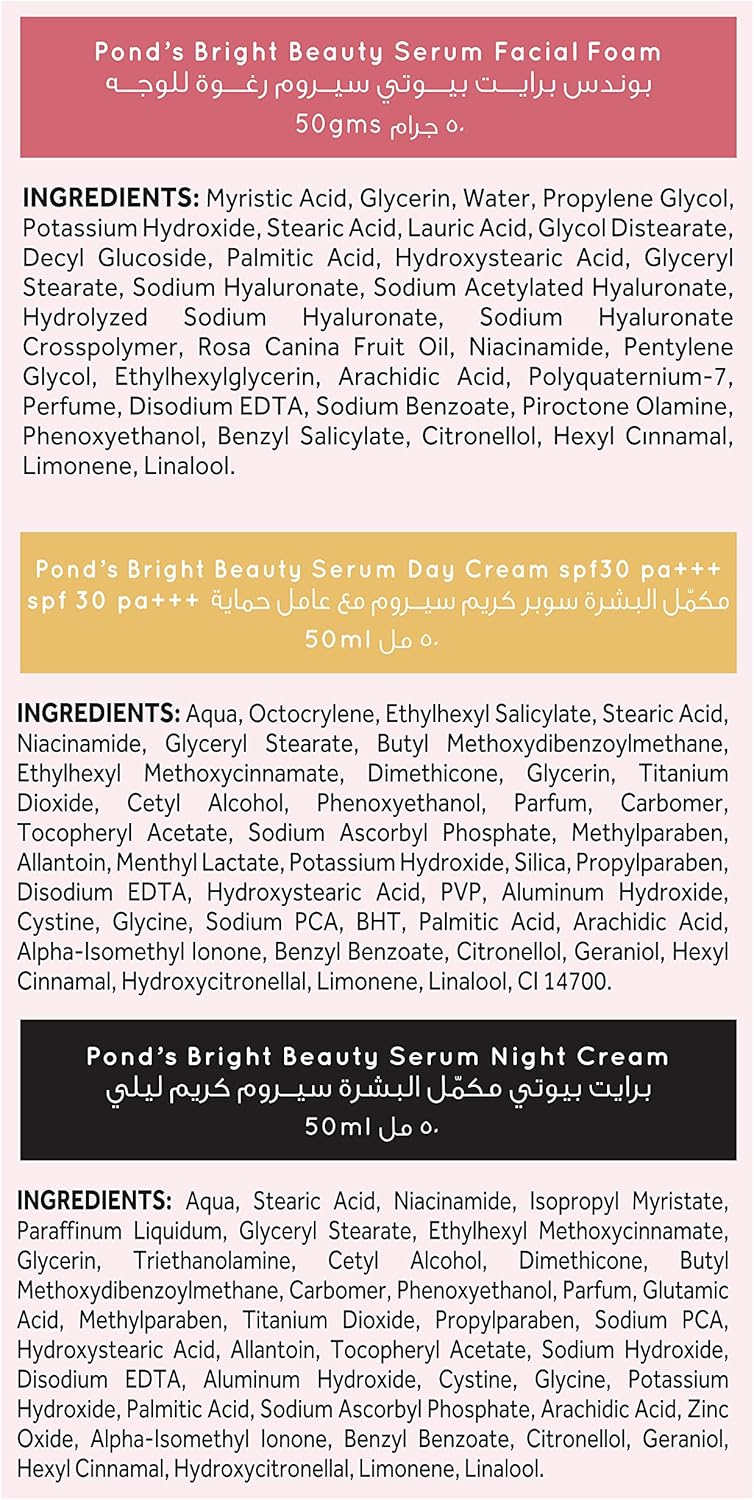 Pond s bright beauty essentials, serum whip facial foam 100g, brightening day cream, 50g and night cream, 50g for brighter, nourished skin, set of 3
