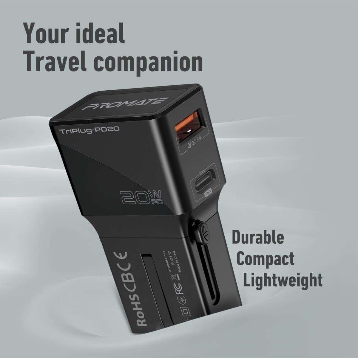 Promate USB-C™ Adapter with Worldwide Plugs, 20W Fast USB-C™ Port and Qualcomm QC 3.0, TriPlug-PD20