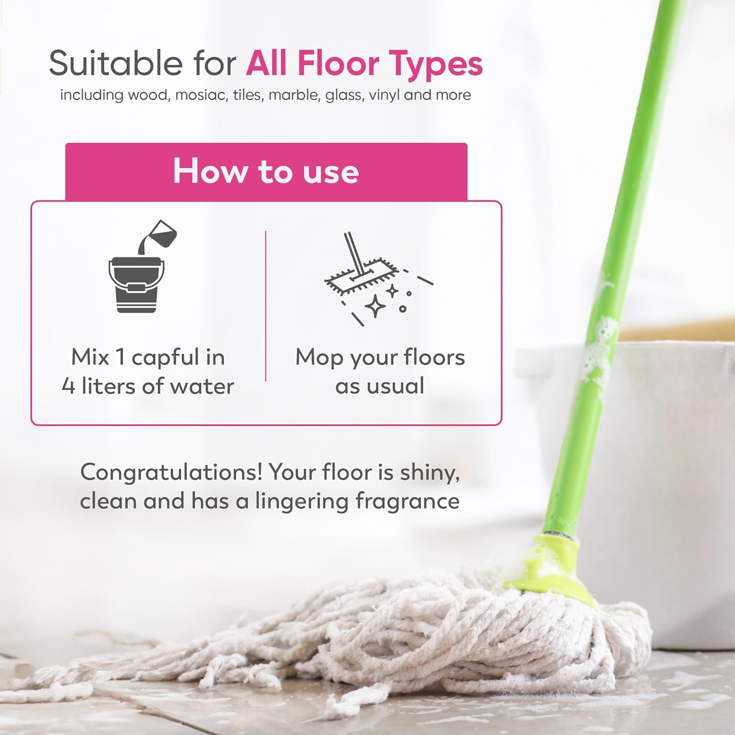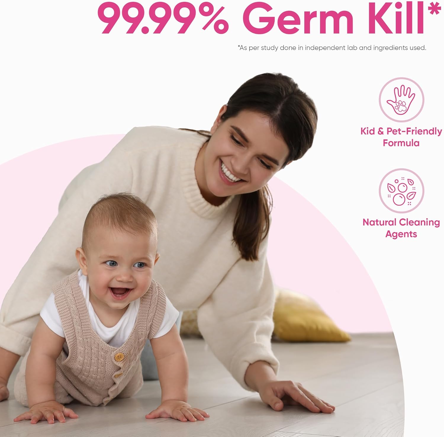 This plant-based floor Surface cleaner provides powerful germ protection by eliminating 99.99% of germs while effortlessly removing stains. Its advanced formula, made with biodegradable agents and natural alkaline ingredients, ensures deep cleaning without harmful fumes. Infused with a soothing spa-like floral fragrance, it leaves your floors fresh and revitalized after every use. Designed for safety and effectiveness, this non-toxic cleaning liquid is completely safe for children and pets, making it perfect for households. Its 99% alkaline-based formula quickly dissolves grease and grime, delivering a streak-free, brilliant shine. Suitable for various surfaces like marble, granite, ceramic tiles, wooden floors, vitrified tiles, and bathroom floors, it provides a hassle-free, spotless clean for your entire home.