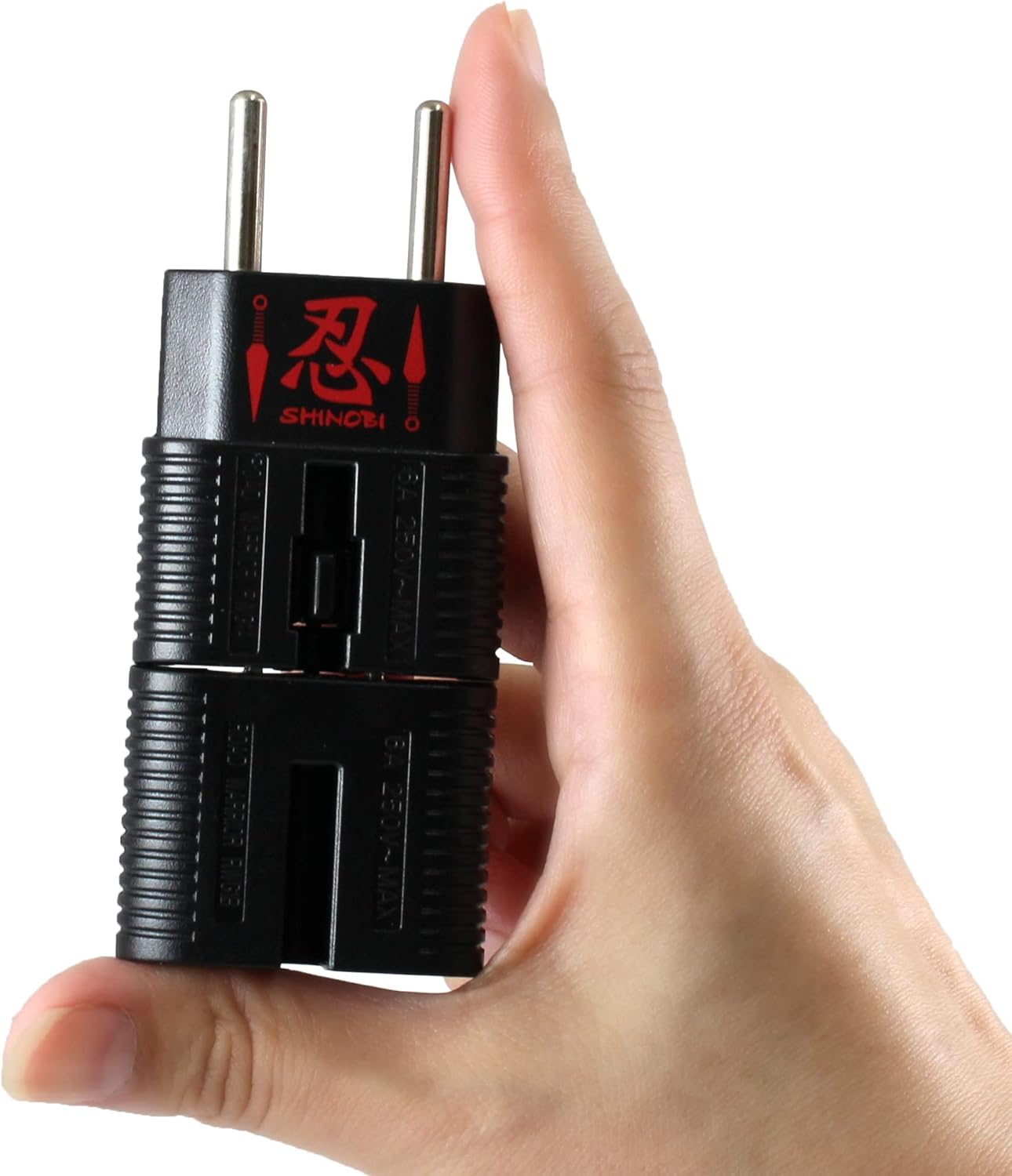 The ultra slim and light universal plug adapter will keep your devices connected and charged when you are traveling to different countries. There are many different outlet configurations around the world, but the 5 most common standards of sockets in the world are the “European” plug with two round pins, the “British” plug with three rectangular pins, the “Australian/Chinese” plug with two slanted pins, and the “American”plug with two vertical pins. The ”SHINOBI” Plug Adaptor enables your appliances to be plugged in to the world’s 5 common types of electrical outlet by changing the pin configuration of your voltage power plug.