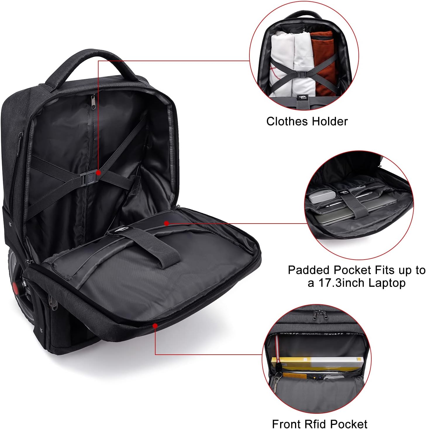 Large Capacity Laptop Backpack: The rolling backpack built-in padded laptop section and tablet section protect your device from scratches The Large compartment can hold 13 inch, 14 inch, 15.6 inch, 17 inch laptop, pad, books, headphones. There is a 20 inch pull rod, which have enough length for you to drag the backpack easily.