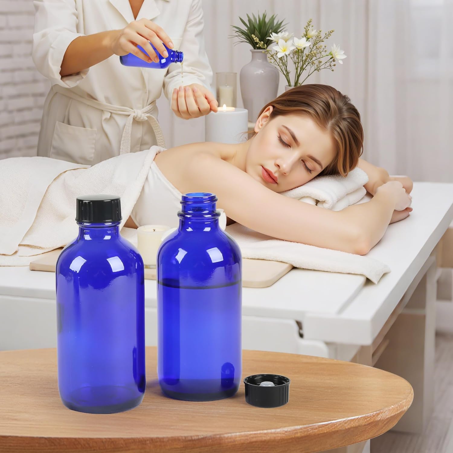 Round Boston Glass Bottle with Lid – Suitable for Packaging and Storing Essential Oils, Liquid Skin Care Products, Shampoos, Etc. -Leak Proof Mini Travel Containers., Blue UV, 4oz 24
