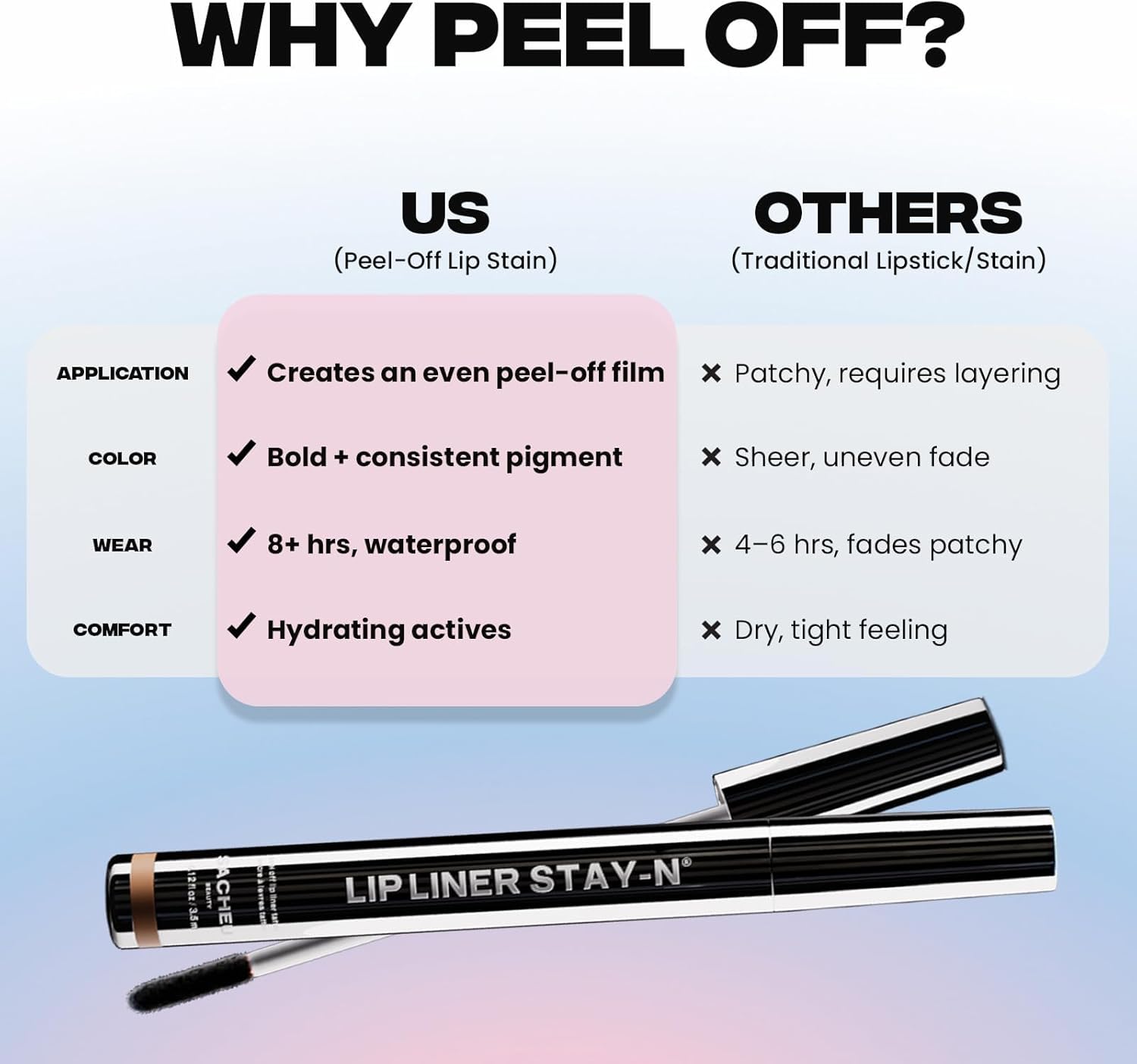 NOURISHING LIP PEEL. Infused with lip-loving ingredients, Hyaluronic Acid and Vitamin E, this liner nourishes your lips while imparting a long-lasting tint for plump-looking and defined, luscious lips.