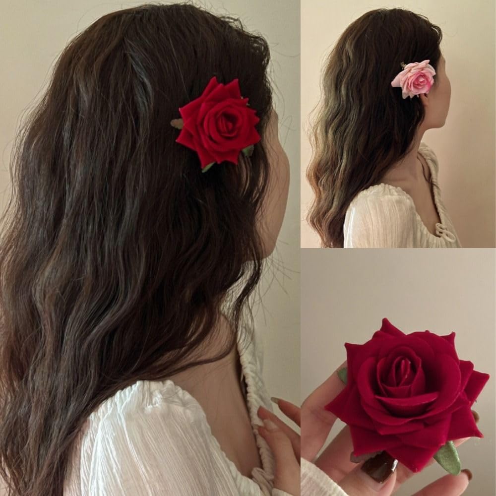 Side Clip Hair Accessories Headdress Flower Hair Clips Fairy Red Rose Hairpin (Red)