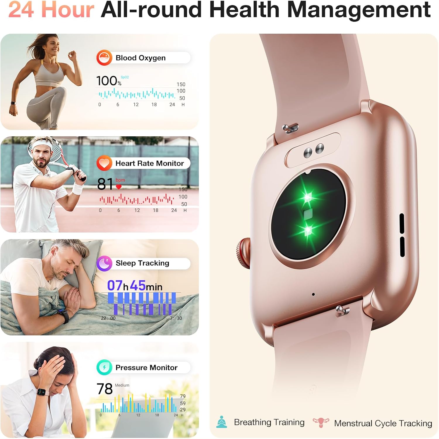 【24/7 HEALTH MONITORING & ACTIVE ALERTS】This smartwatch for women men provides round-the-clock tracking of your steps, distance, and calories burned. Equipped with advanced high-precision sensors, it accurately monitors your heart rate, blood oxygen levels, sleep quality and stress in real time. The smart watch will actively alert you with a vibration if any of your metrics deviate from the norm during daily activities. It also provides reminders for drinking water, alarms, reaching fitness goals, and women’s health notifications. Your health is in good hands with this smartwatch!