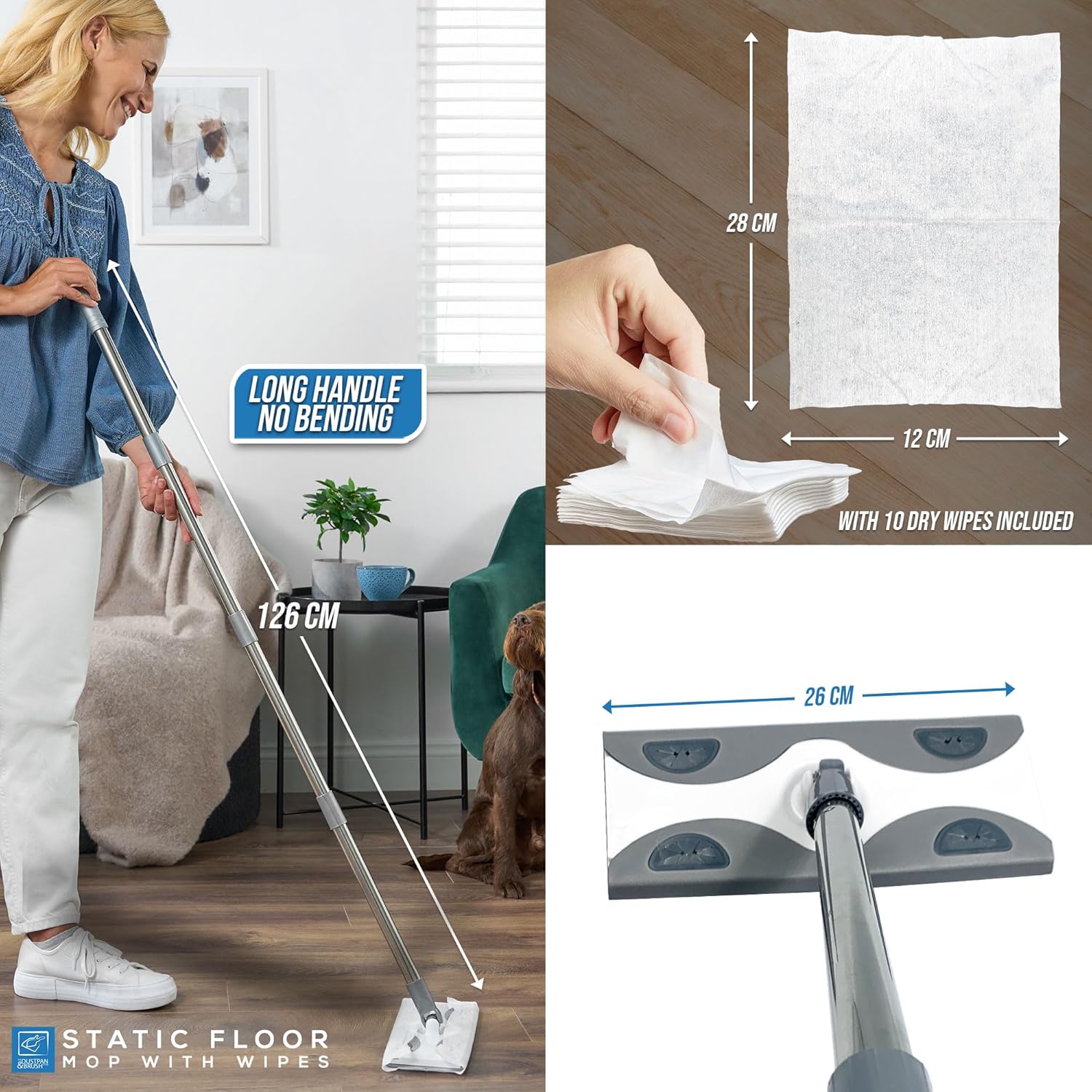 Static Floor Wipes Mop, Flat Mop with Disposable Floor Wipes for Quick and All-Purpose Cleaning, Mops for Laminate, Tiled, Wooden, or Vinyl − Dust Kit with 10 Dry Wipes