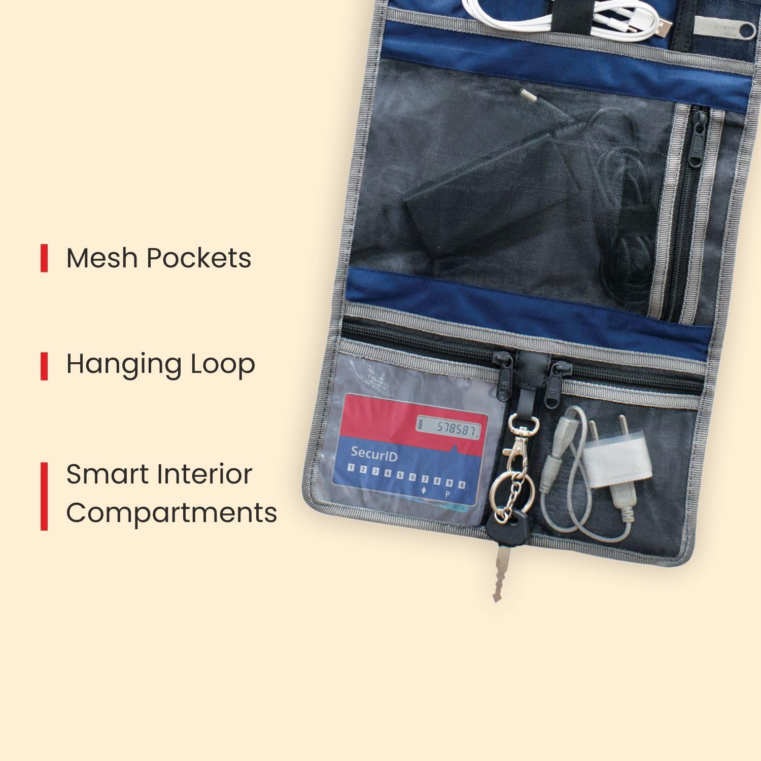 Durable & water resistant fabric. Rolls up to fit in a small space in bag. Multi elastic holders to organize various cables. In-built stylus holder. 1 mesh pocket with zipper for power bank / external hard drive. 1 additional mesh pocket for storing misc. accessories like travel adapter. 1 mesh pocket with zipper for storing mobile / USB Charger. 1 mesh pocket with velcro for storing 3 USB / Memory Card. 3 smart slots for storing 3 SIM / SD Card. Material 100% polyester 1000D DIMENSIONS: H:61.5 x L:25 x W:3.5 (In cms) Approx. (When Open) H:17 x L:25 x W:3.5 (In cms) Approx. (When Folded)