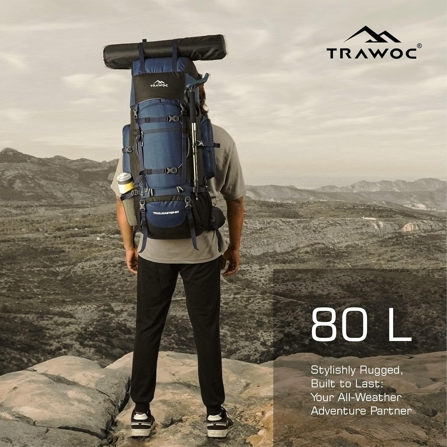 Introducing the Trawoc versatile and feature-packed Adjustable 80 ltr Backpack, the perfect companion for all your outdoor adventures! Designed for adventurers and travelers, this waterproof rucksack is built to withstand the toughest conditions while keeping your belongings safe and dry. With its large capacity and multiple compartments, it’s the ultimate backpack for traveling, ensuring you have everything you need right at your fingertips.Our multi-purpose 80-liter backpack is not just functional but also incredibly stylish, making you stand out wherever you go. Whether you’re embarking on a trek, hike, or camping trip, our durable backpack is up for the challenge. It even comes with a shoe compartment, so you can keep your gear organized. Worried about sudden downpours? Our rucksack with a rain cover has got you covered, providing extra protection for your belongings. The integrated rain cover is a game-changer for those unpredictable weather conditions. Comfort is key during your outdoor escapades, and our lightweight rucksack ensures you carry your essentials with ease. The front and top-loading options make packing a breeze, while the backpack’s ergonomic design ensures a comfortable fit for both men and women. Don’t forget the dedicated laptop compartment, so you can stay connected even in the wilderness.This 80 liter travel backpack is a must-have for your next adventure, whether it’s a day hike or an extended backpacking trip. It serves perfectly as a trekking backpack, 80L rucksack, or 80-liter trekking bag, catering to all your needs. Our camping bag is also ideal for long trips, making it a reliable long trip bag. This hiking backpack bag is designed for both men and women, ensuring everyone can enjoy its benefits.