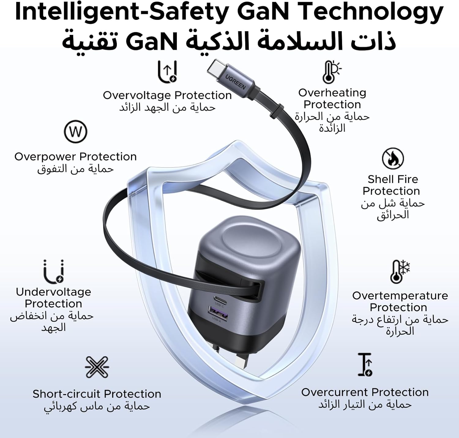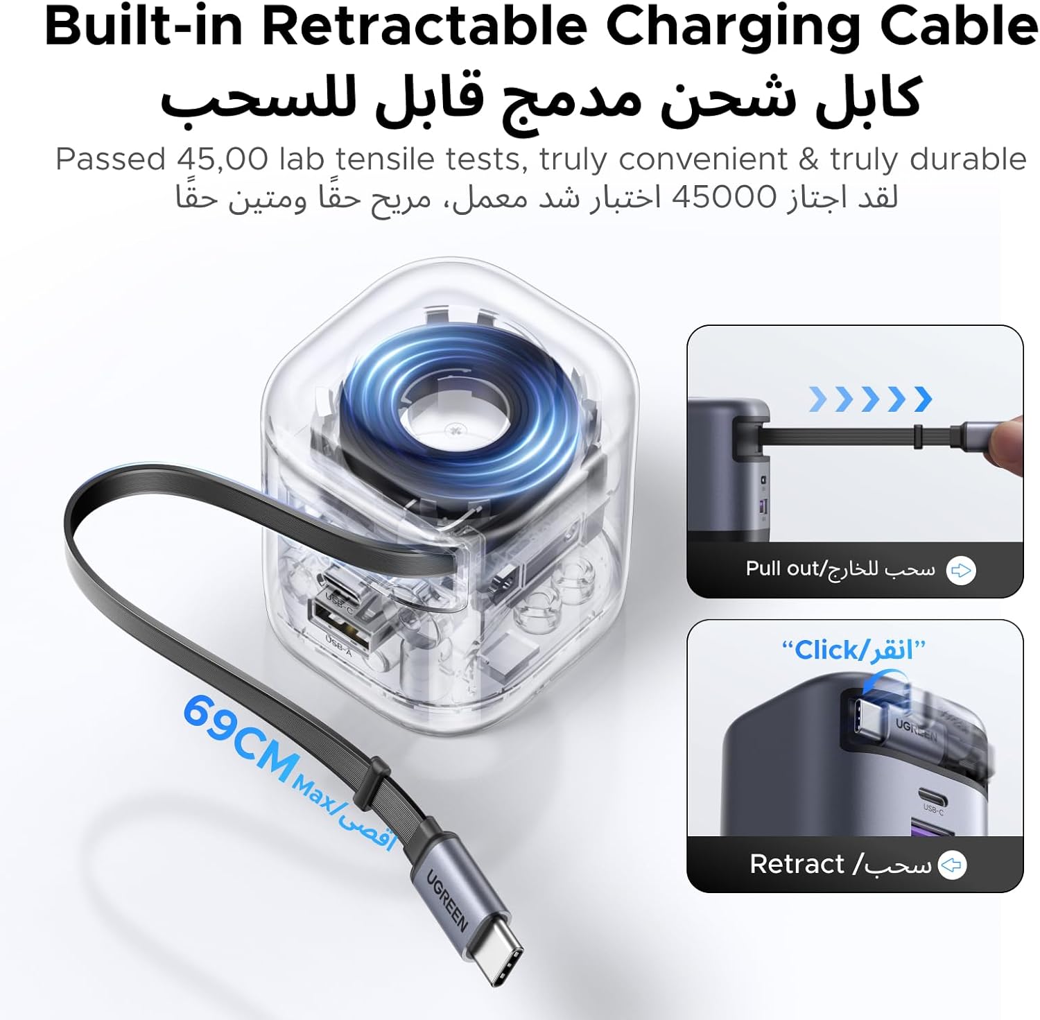 【Grab & Go Built-in Retractable Cord】UGREEN’ s revolutionary 45W GaN charger features a smart retractable cable (69cm) with one-touch auto-rewind—no more tangles! Despite the built-in cable, it’s 30% smaller than standard 45W chargers. Packing 45W fast charging in a small-sized body, it’s the ultimate tangle-free, space-saving and convenient power solution for travel.