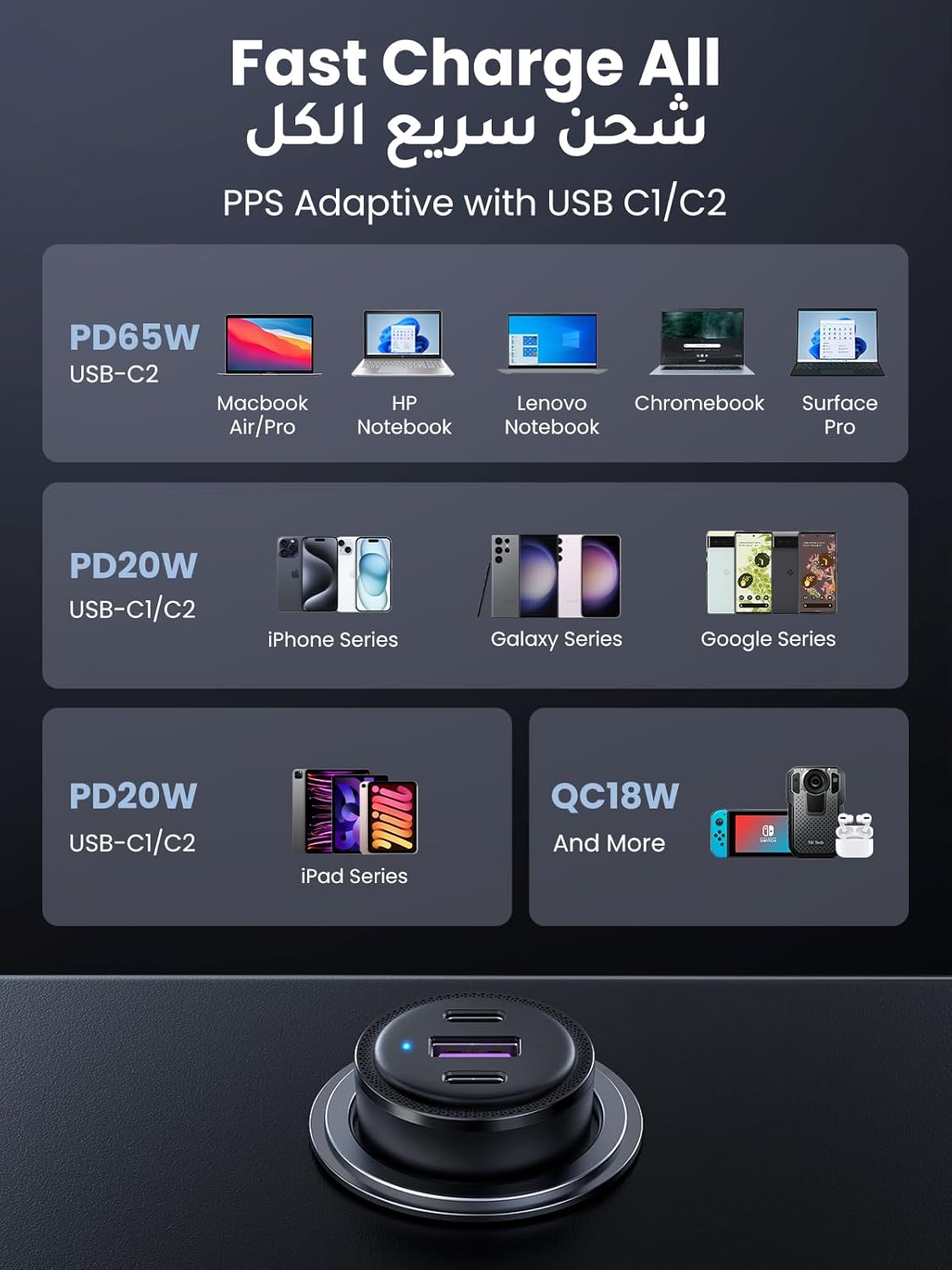 【Broad Compatibility】UGREEN fast car charger works perfectly with USB-C and USB-A powered laptops, smartphones and other devices like iPhone 16 Pro Max/iPhone 16 Pro/iPhone 16/iPhone 16 Plus/iPhone 15 Pro/15 Pro Max/15/15 Plus, Steam Deck, MacBook Air/MacBook Pro, Samsung Galaxy S23 Ultra/S23/S22/S21/A90/A80/A71/Note 10, iPhone 14 /14 Pro/14 Pro Max/14 Plus /13 /12 /11/XS/XS Max/XR/8, iPad Pro/Air/mini, Lenovo Yoga 920, Dell XPS 13/Inspiron, HP Spectre, Surface Go Tablet, Google Pixelbook, Pixel 3a/4(XL), P20/P30/P40/P50/Mate 20/Mate 30, Switch, etc