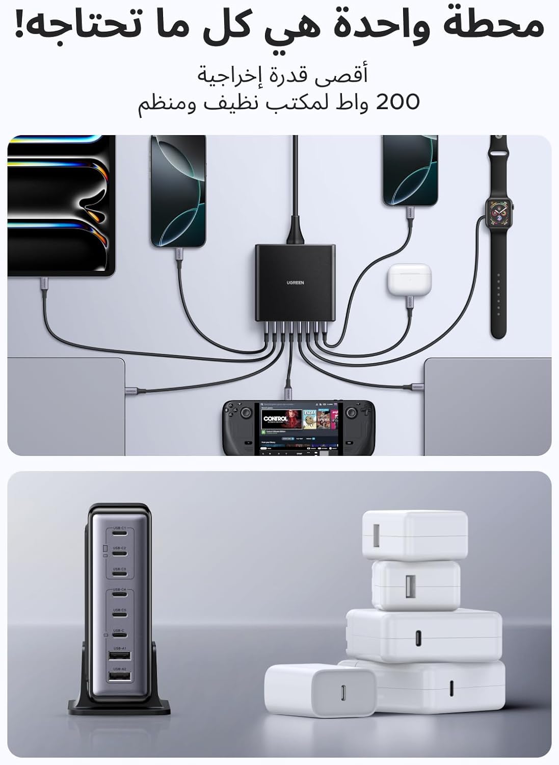 【8-Port 200W Hyper-Powered GaN Charging Station】Charge your device with the total 200W power! This premium GaN station 8 devices(laptops, tablets, phones…) simultaneously via 6*USB C and 2*USB A. Perfect for Middle Eastern homes/offices using multiple Apple and Android devices simultaneously.