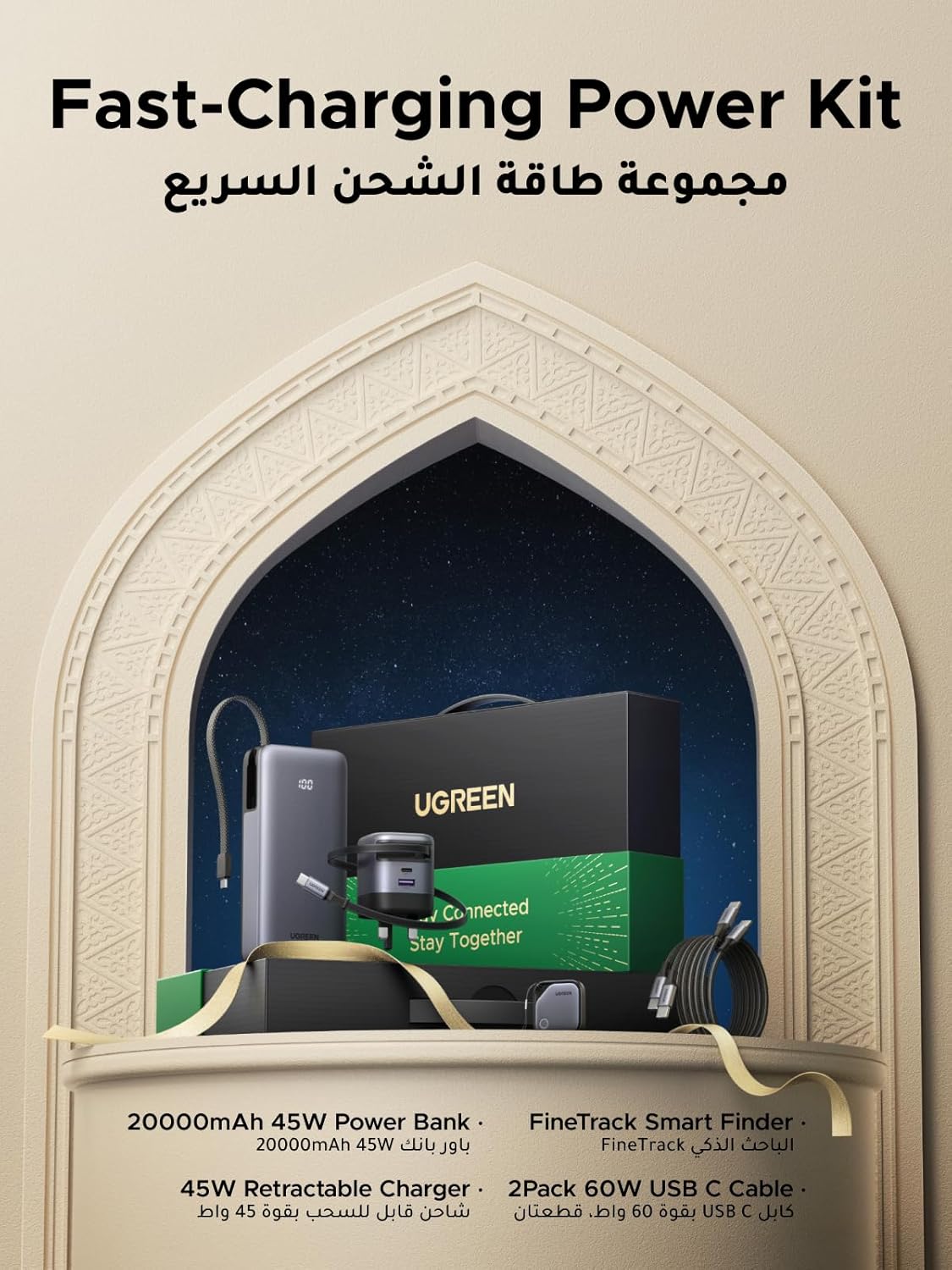 UGREEN Power Kit, Includes 20000mAh 45W Power Bank, Retractable USB C Charger, 60W USB C Cable, FineTrack, Charging Kit for iPad/Phone/Watch etc, Perfect for Business and Travel