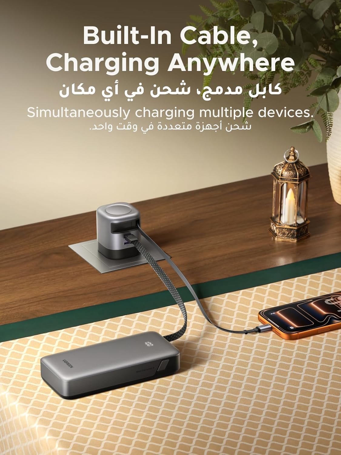 Built-in and tangle free cables: no mess of cables. The power bank has a built-in USB-C braided cable, and the charger features a retractable cord with one touch. This design requires extra cables. No more tangling cables, keeping your bag organized wherever you go.