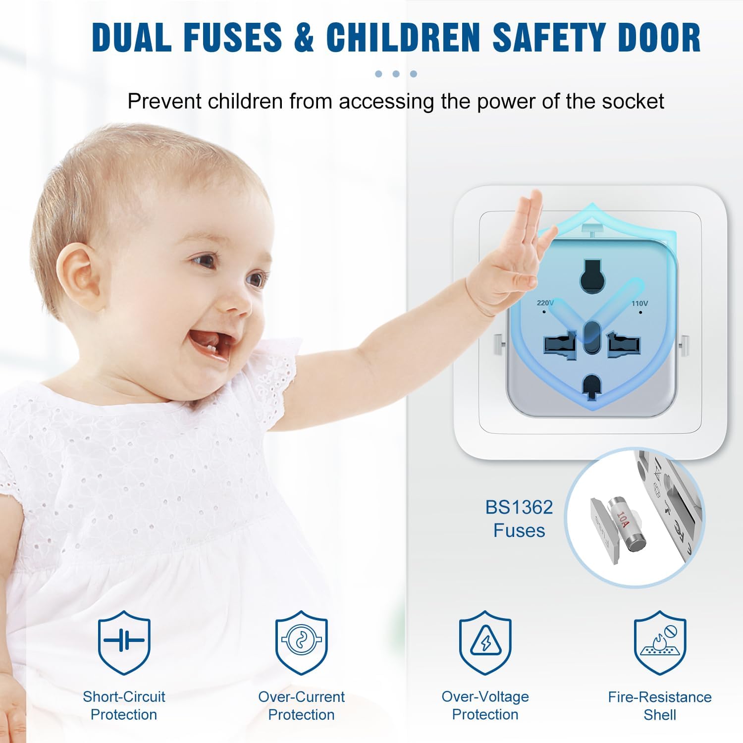 Dual fuse: International Power Adapters provide robust protection for your devices and keep ready for any unforeseen power emergencies with the third-generation BS1362 fuse. The International Power Adapters keep high-power appliances safe while devices stay fully charged. The spare fuse included gives you double protection.