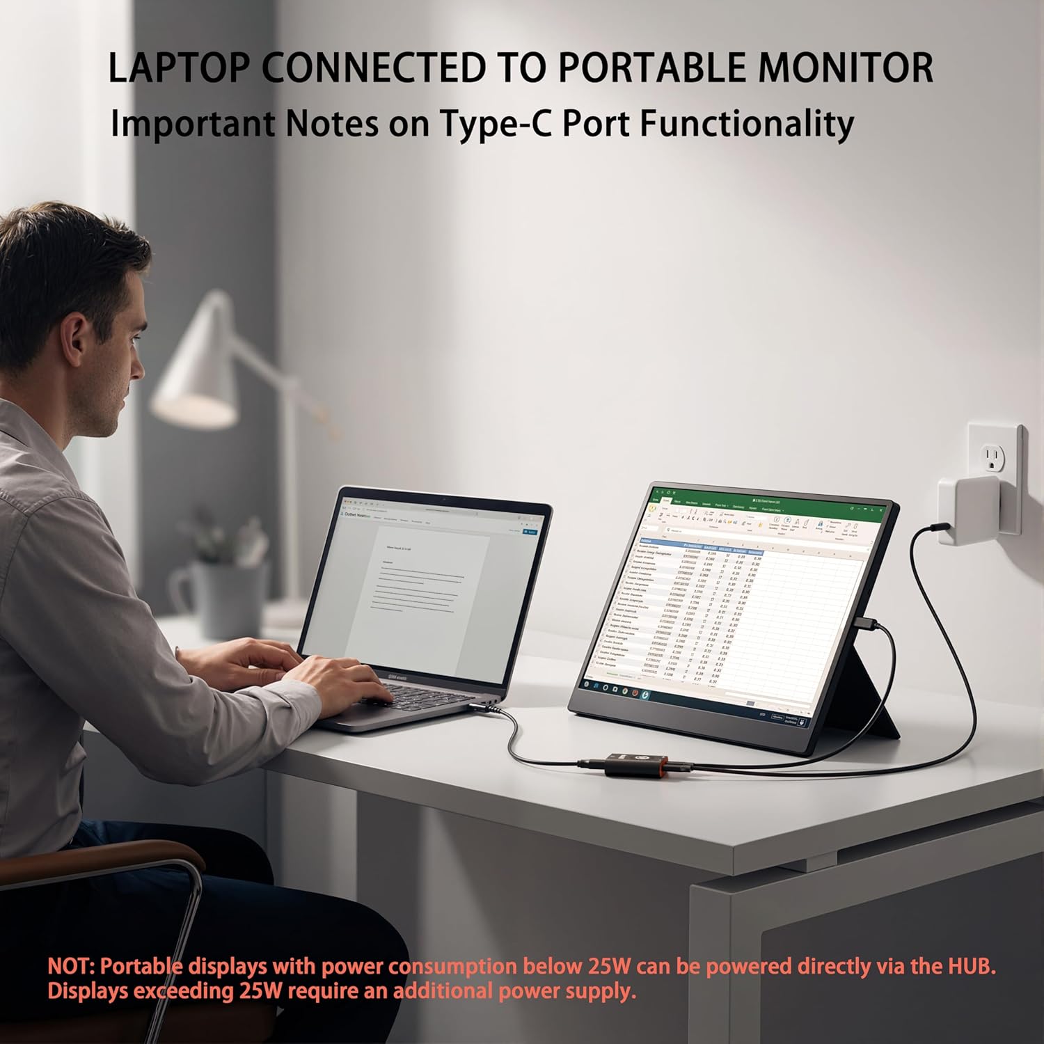 Compatible with USB-C Portable Monitors: When the portable display’s power consumption is below 25W, the hub can easily power it. If your portable display requires more than 25W, you must first connect an external power source to the display before connecting it to the hub. Otherwise, the display may operate intermittently or experience screen blackouts. Please note the power consumption of the monitor