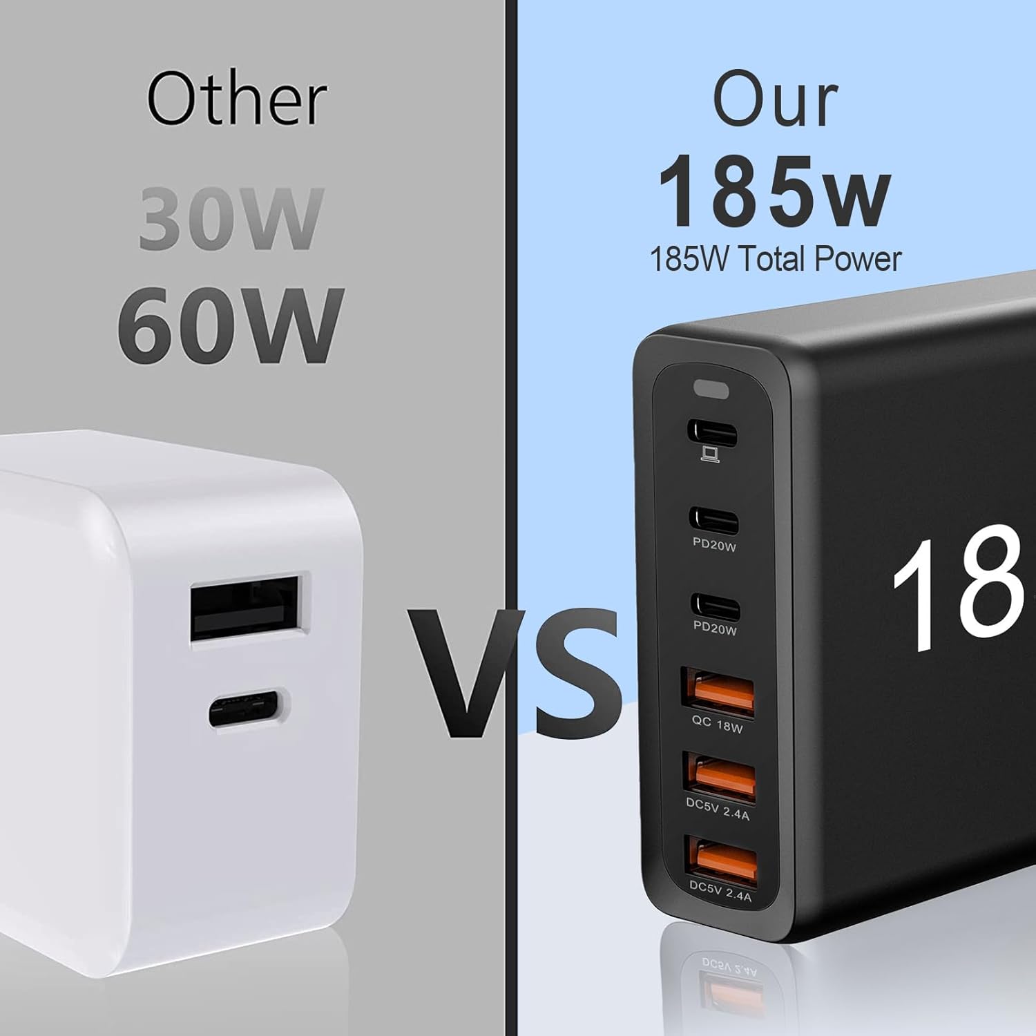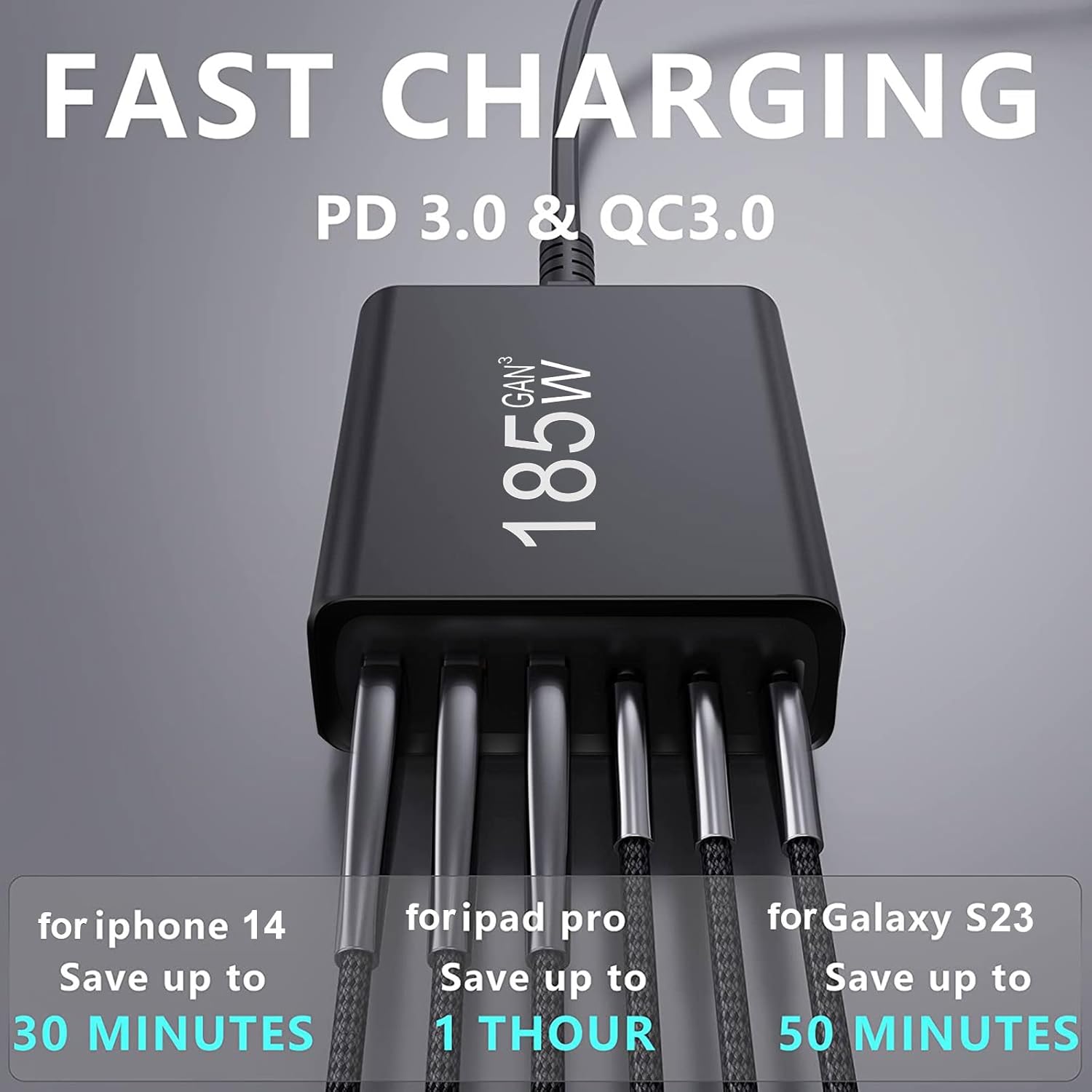 185w Total Power:This USB GaN charger has a total output power of 185 watt and three USB-A ports and three USB-C ports. Independent use of first USB-C port, providing full speed PD charging for laptops or phone. Six ports support fast charging of six devices simultaneously, and one charger can replace six, saving you time and space.