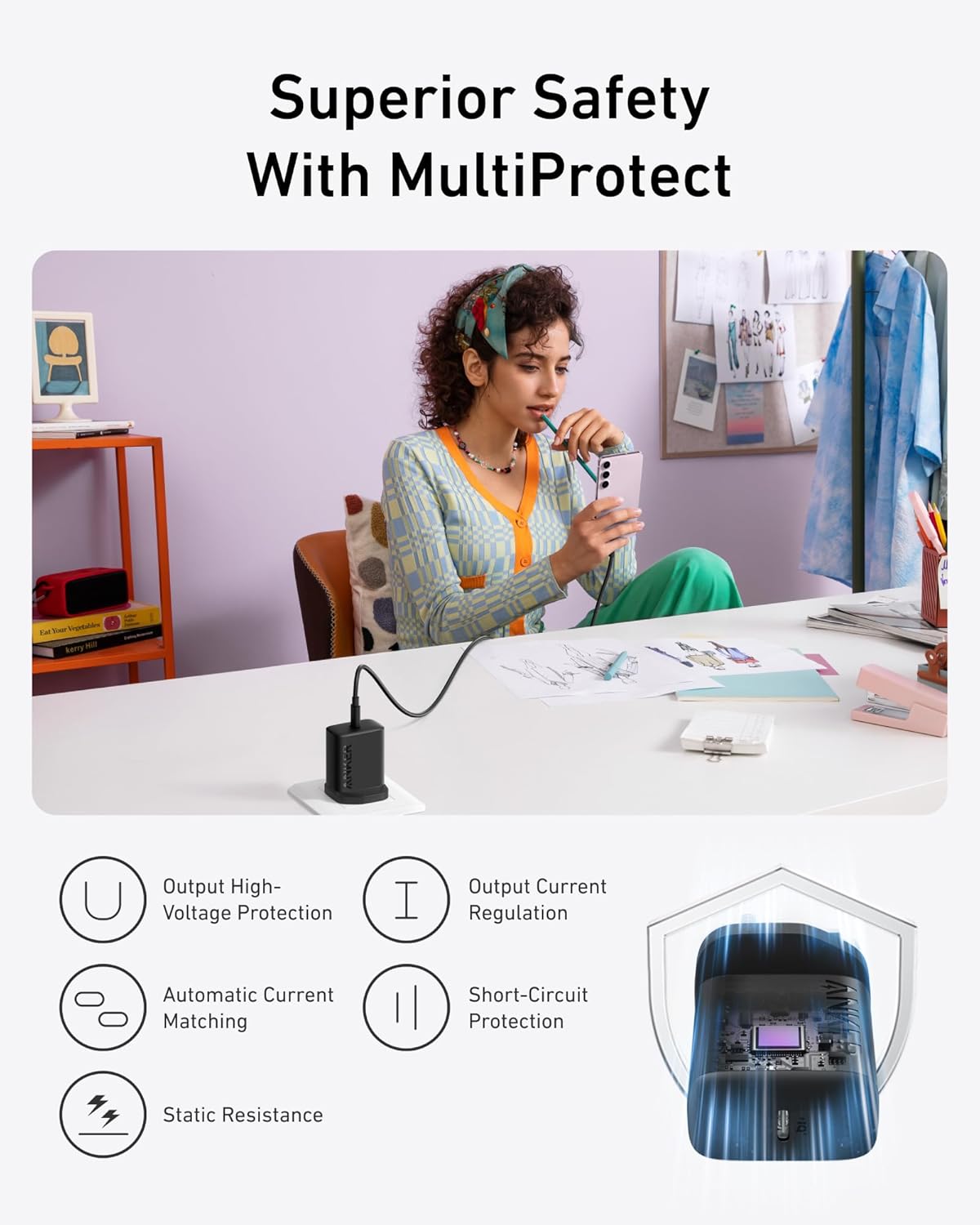 Charge Safely, Every Time: Safeguard your devices with the MultiProtect safety system, designed to regulate current, protect against high voltages, and prevent short circuits.