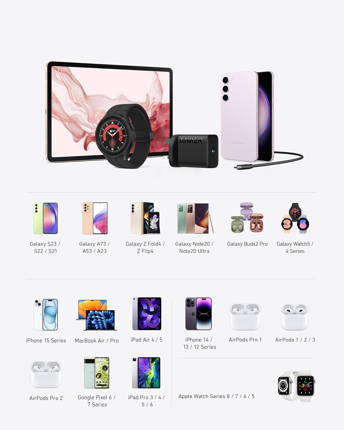 Model Number A2652 Input 100-240V~, 0.8A, 50-60Hz Output 5V⎓3A / 9V⎓2.77A Programmable Power Supply: PPS 3.3V-11V⎓2.75A Max (25W Max) Dimensions 1.77 × 1.10 × 1.97 in / 4.5 × 2.8 × 5.01 cm Weight 2.29oz/65g Compatibility For Samsung: Galaxy S23 / S22 / S21 Galaxy A73 / A53 / A23 Galaxy Z Fold4 / Z Flip4 Galaxy Note20 / Note20 Ultra Galaxy Tab S8 / S7 Series Galaxy Buds 2 Pro Galaxy Watch5 / 4 Series Compatibility For Apple: iPhone 15 / 14 / 13 / 12 Series iPad Air / Pro MacBook Air AirPods Pro 1 / 2 AirPods 1 / 2 / 3 Apple Watch Series 8 / 7 / 6 / 5 Compatibility Google Pixel 6 / 7 Series Sony Xperia 1 IV / III Nintendo Switch Note You’ll need a USB-C to USB-C cable to charge USB-C devices (included) and a USB-C to Lightning cable to charge Lightning devices (sold separately).