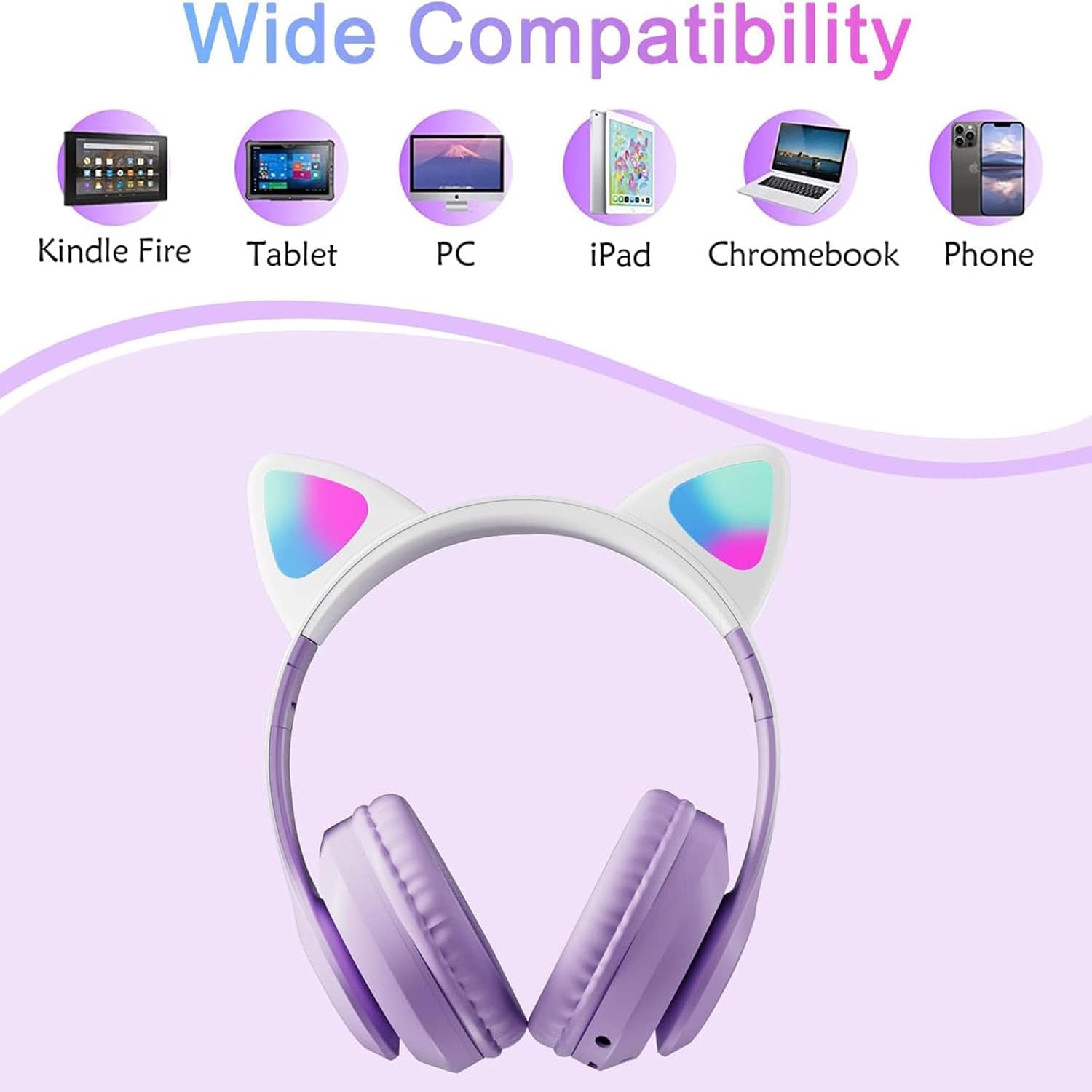 X spring Cat Ear Kids Headphones, Wireless Foldable Kids Bluetooth Headset, LED Light Up Bluetooth Kids Headphones with Microphone, Cute Stereo Over Ears Headphones for Toddler Girls Adult (Purple)