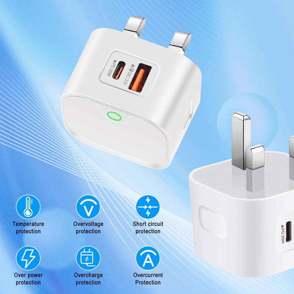 【Dual Port Fast Charger】This 25w fast charger combines one USB-C port and one USB-A port. It can identify the appropriate current and charge each of your devices in the best way with a total of 25W output, ensuring that your devices are charged at the maximum speed.
