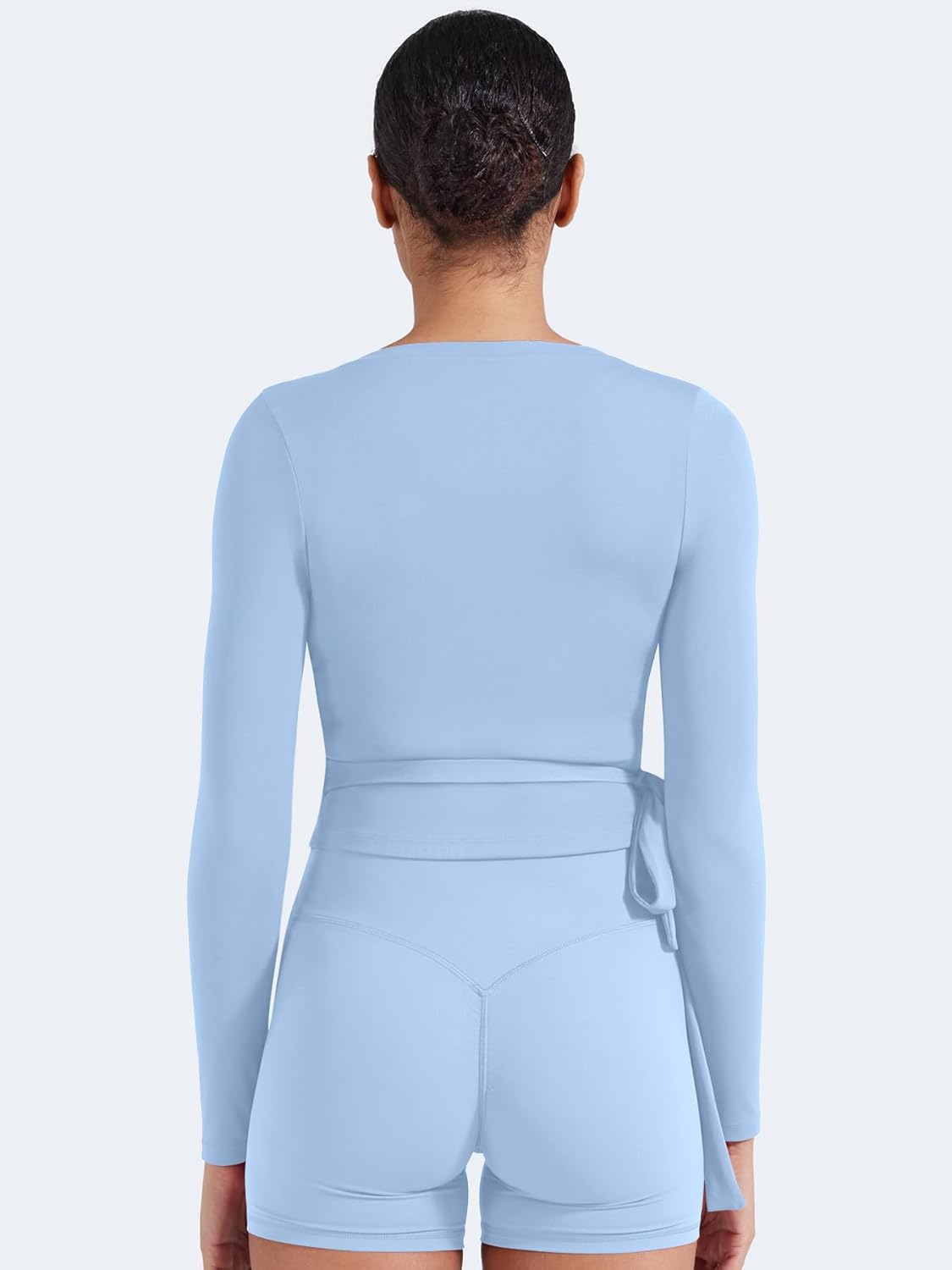 YEOREO Women Pilates Wrap Top Long Sleeve Tie Ballet Workout Yoga Shirt Michelie Y2K V Neck Cropped Tops